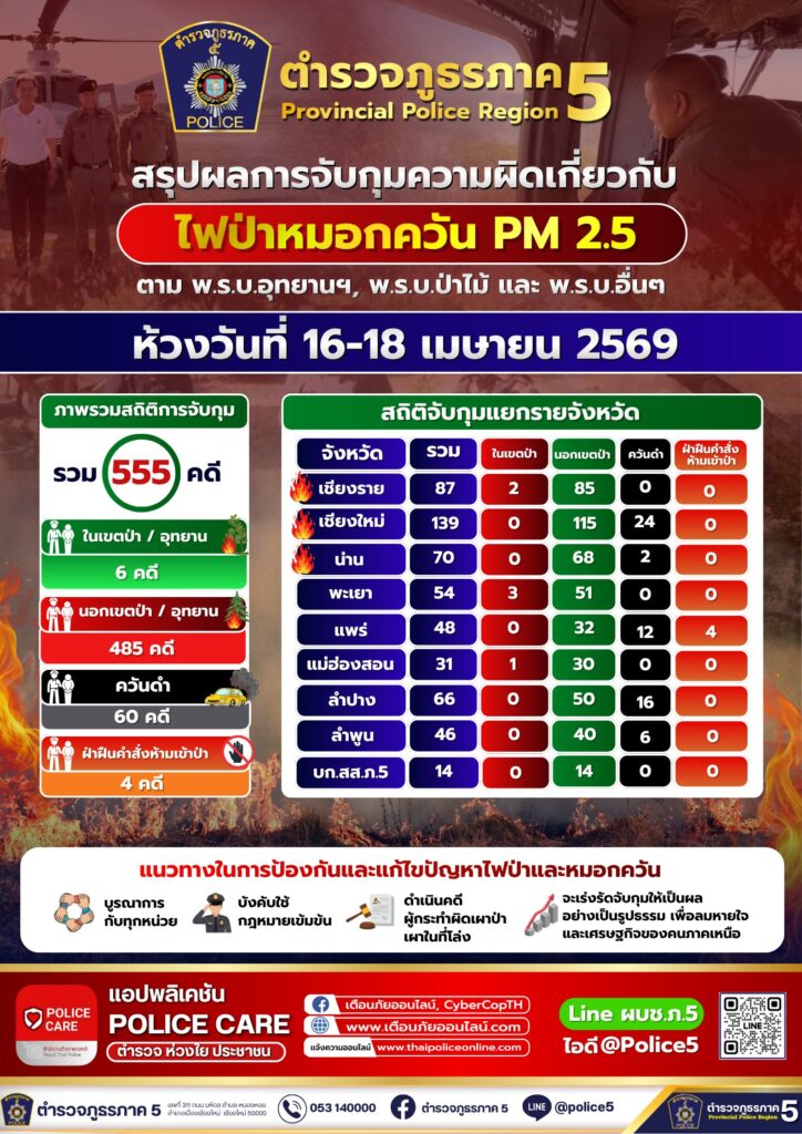 ตำรวจภูธรภาค5 เข้ม!!! จับจริงไม่มีเว้น มือเผาและรถปล่อยควันดำ ล่าสุด 3 วัน (16-18 เม.ย.69) จับแล้ว 555 คดี