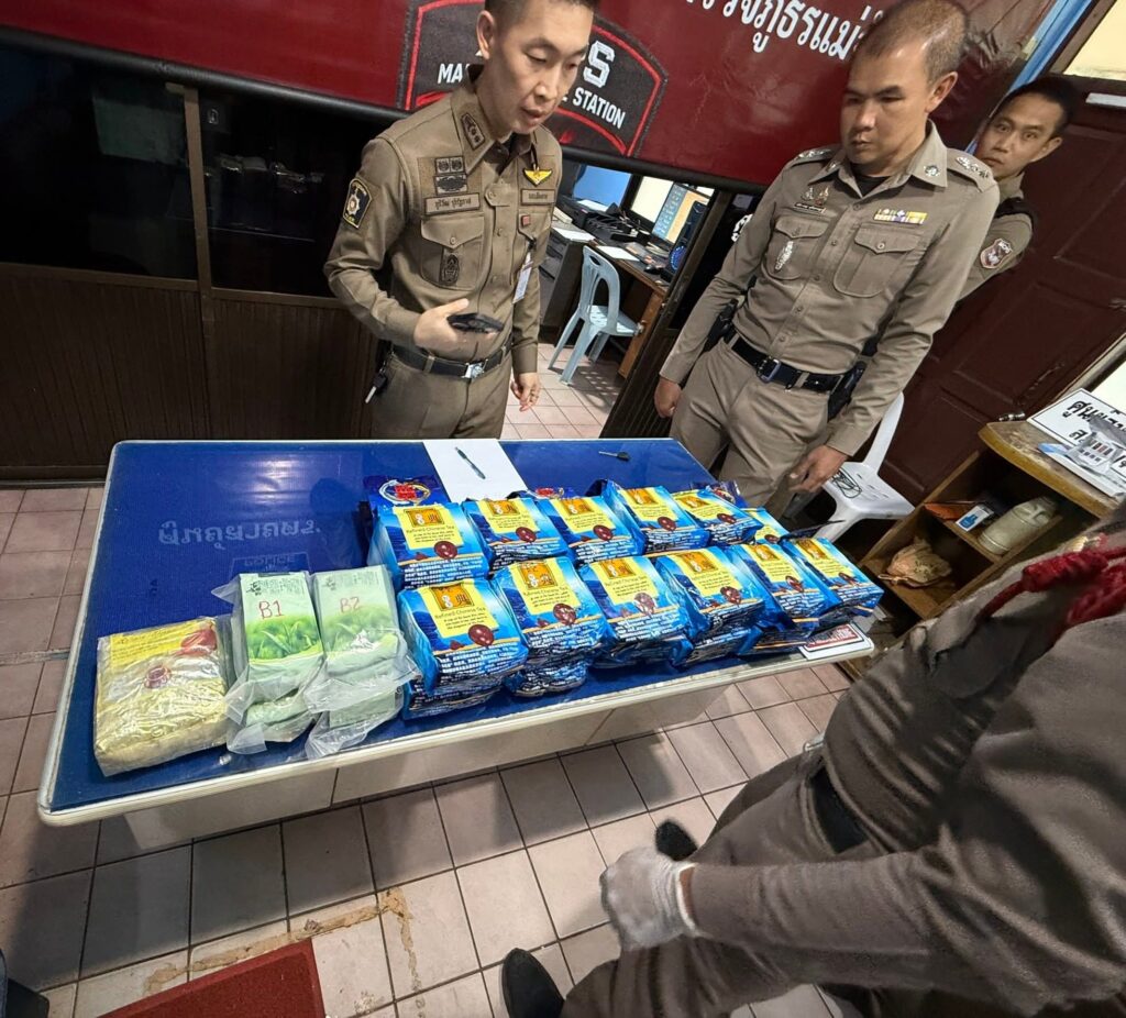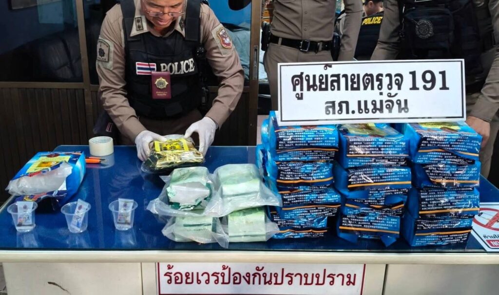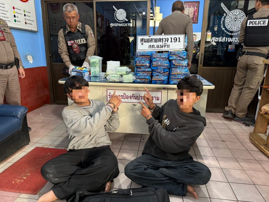 วันนี้ 30 เมษายน 2569 เวลาประมาณ 15.00 น. เจ้าหน้าที่ตำรวจสายตรวจ191 สภ.แม่จัน ได้ทำการตั้งจุดตรวจจุดสกัดยาเสพติดพื้นที่บ้านเวียงสา ม.7 ต.ศรีค้ำ อ.แม่จันฯ ขณะตั้งจุดตรวจฯ อยู่นั้น ได้มีรถจักรยานยนต์ต้องสงสัยเด็กผู้ชาย 2 คน ขับเข้ามา 1 คัน ท่าทางพิรุธต้องสงสัย ขณะเจ้าหน้าที่ตำรวจฯ กำลังตรวจสอบอยู่นั้น ได้มีรถจักรยานยนต์อีก 1 คัน ซ้อน 2 ชายทั้งคู่ ขับตามเข้ามาลักษณะรีบร้อนและมีกระเป๋าใบใหญ่สีดำวางไว้หว่างขาของคนขับ เมื่อทั้งสองคนพบเห็นว่าเจ้าหน้าที่ตำรวจฯ กำลังตั้งจุดตรวจจุดสกัดอยู่นั้น ตกใจ! จะหักรถจักรยานยนต์หลบหนี แต่ได้แสลบลงข้างทาง เจ้าหน้าที่ฯ จึงได้ควบคุมตัวทั้งสองคนไว้ได้