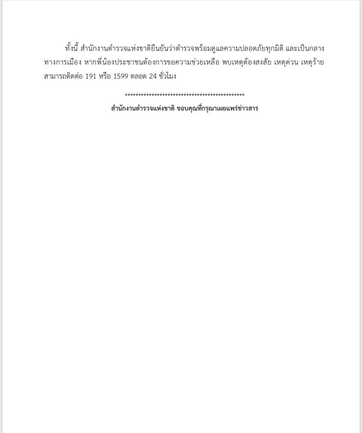 ทั้งนี้ สำนักงานตำรวจแห่งชาติยืนยันว่าตำรวจพร้อมดูแลความปลอดภัยทุกมิติ และเป็นกลางทางการเมือง หากพี่น้องประชาชนต้องการขอความช่วยเหลือ พบเหตุต้องสงสัย เหตุด่วน เหตุร้าย สามารถติดต่อ 191 หรือ 1599 ตลอด 24 ชั่วโมง