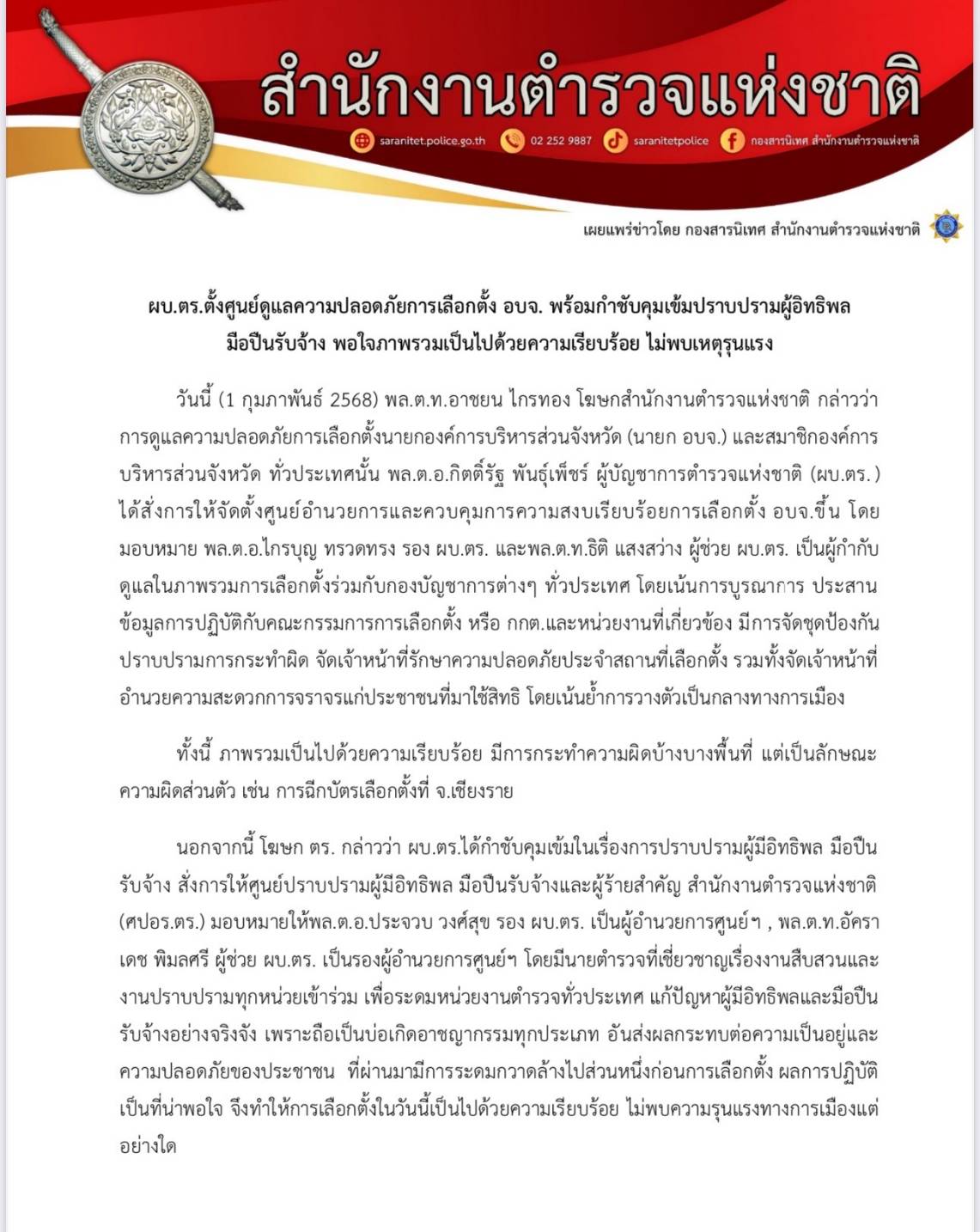 ผบ.ตร.ตั้งศูนย์ดูแลความปลอดภัยการเลือกตั้ง อบจ. พร้อมกำชับคุมเข้มปราบปรามผู้อิทธิพล มือปืนรับจ้าง พอใจภาพรวมเป็นไปด้วยความเรียบร้อย ไม่พบเหตุรุนแรง