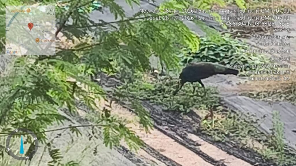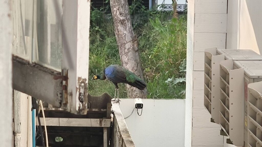 เมื่อวานนี้ ช่วงเวลา 16.00 น ชาวบ้านในย่านสันติธรรม ถนนเจริญสุข ตำบลช้างเผือกอำเภอเมืองเชียงใหม่ จังหวัดเชียงใหม่ อยู่ๆมีนกยูงออกมาริมกำแพงก่อนเดินลงไปอยู่ในพื้นที่ว่าง ซึ่งจากการสังเกตไม่มีอาการตื่นตระหนกหรือหวาดกลัวใดๆออกเดินหากินอีกต้นหญ้าไปตามปกติ พอเข้าไปอยู่ใกล้ๆก็จะหลบแต่ไม่มีอาการตื่นกลัว อย่างไรก็ตามไม่แน่ใจว่าจะเป็นนกยูงมาจากดอยสุเทพหรือไม่เพราะจากจุดนี้อยู่ใกล้ สี่แยกรินคำ ซึ่งมีบ้านประชาชนจำนวนมากหรืออาจจะเป็นนกยูงที่เลี้ยงไว้ เพราะดูจากพฤติกรรมของนกยูงแล้วไม่ตื่นกลัวเมื่อเจอผู้คน แต่ถ้าหากเข้าไปใกล้ก็จะคอยหลบเลี่ยงเพื่อป้องกันตามสัญชาตญาณ