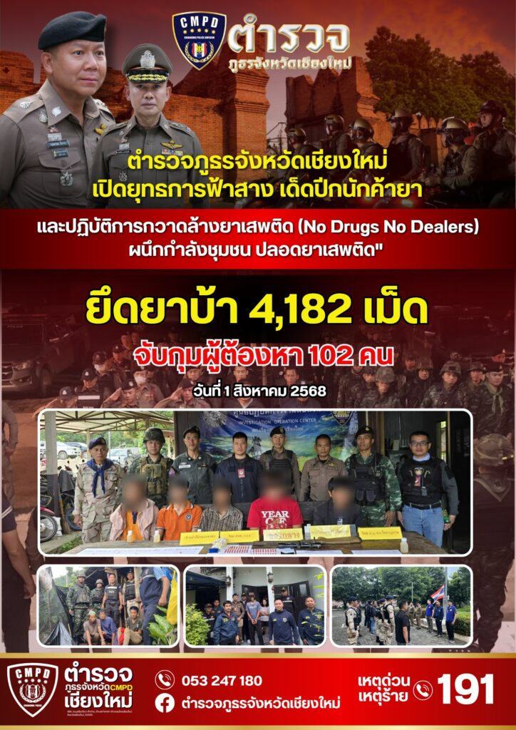 ตำรวจภูธรจังหวัดเชียงใหม่ เปิดยุทธการฟ้าสาง เด็ดปีกนักค้ายา และ “ปฏิบัติการกวาดล้างยาเสพติด (No Drugs No Dealers) ผนึกกำลังชุมชน ปลอดยาเสพติด” วันเดียว ยึดยาบ้า 4,182 เม็ด จับกุมผู้ต้องหา 102 คน