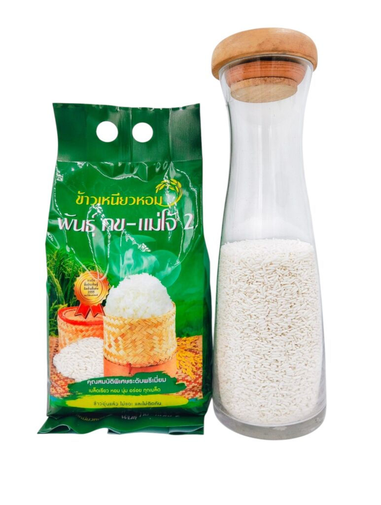 ข้าวเหนียวหอม “กข-แม่โจ้ 2” เป็นข้าวเหนียวมีกลิ่นหอมอ่อน เมล็ดเรียวยาว ปรับปรุงพันธุ์ให้มีลำต้นเตี้ย ไม่ไวต่อช่วงแสง ให้ผลผลิตสูง ทำให้ปลูกได้ทั้งนาปีและนาปรัง ได้รับรางวัลผลงานวิจัยดีเด่น ประจำปี 2555 จากสภาวิจัยแห่งชาติ และ ได้รับการรับรองพันธุ ์ จากกรมการข้าว เมื่อวันที่ 8 เมษายน 2558 ข้าวเหนียวหอม “หอมแม่โจ้ 90 ปี” ปรับปรุงพันธุ ์ให้มีลักษณะต้นตี้ย ต้านทานการหักล้ม ไม่ไวต่อช่วงแสง ปลูกได้ทั้งฤดูนาปี และนาปรัง