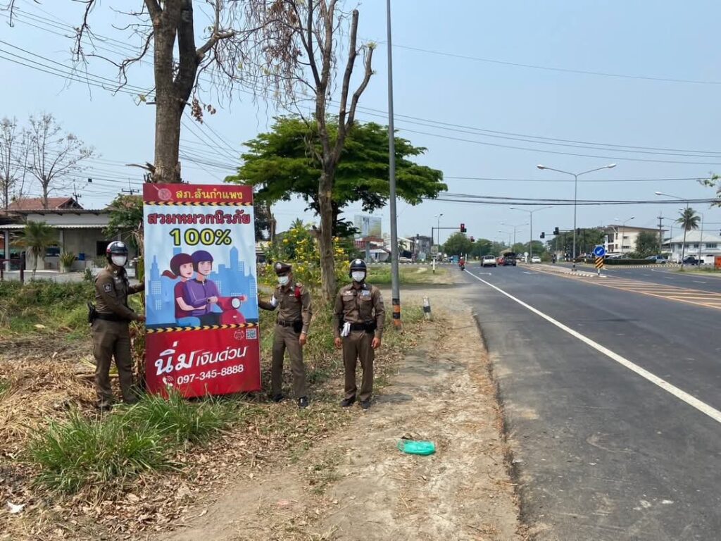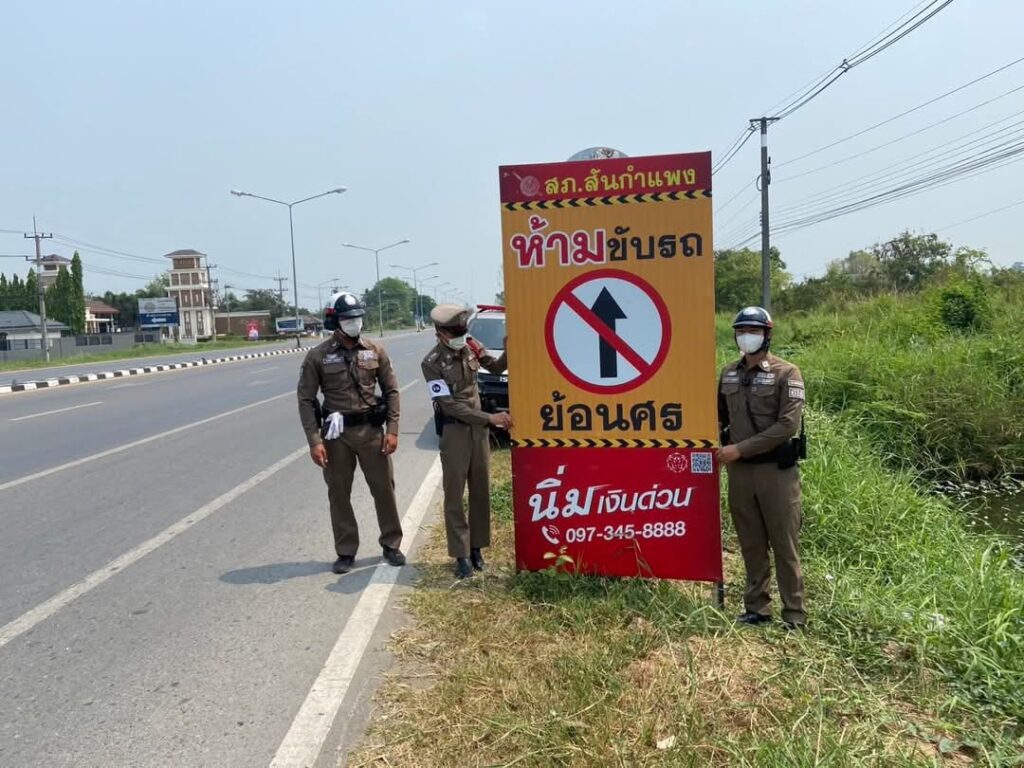 เชียงใหม่- สภ.สันกำแพง เชียงใหม่ใส่ใจประชาชน เจ้าหน้าที่ตำรวจจราจร สภ.สันกำแพง ติดตั้งป้ายรณรงค์ลดอุบัติเหตุช่วงหยุดยาว เทศกาลสงกรานต์ 2568