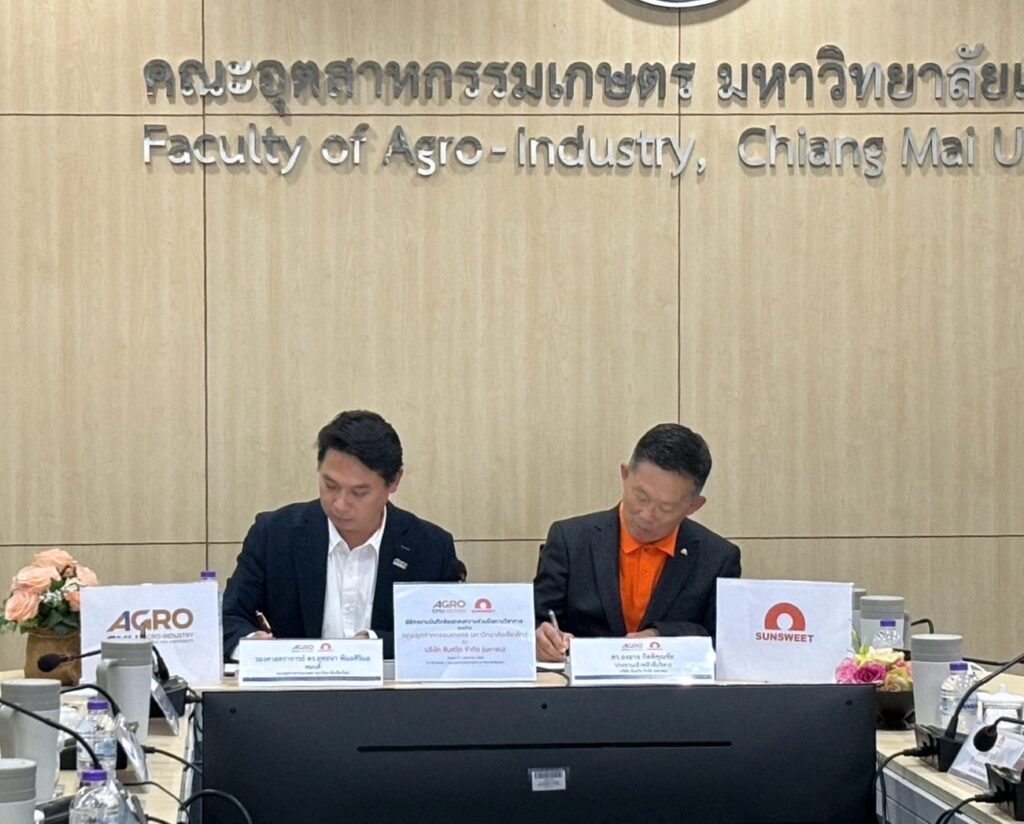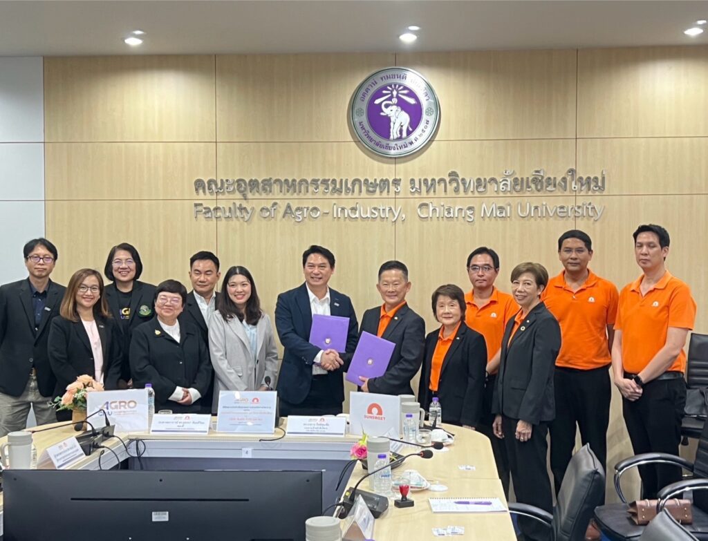 วันที่ 2 พฤษภาคม 2568 – บริษัท ซันสวีท จำกัด (มหาชน) หรือ SUN ลงนามในบันทึกข้อตกลงความร่วมมือทางวิชาการ (MOU) กับ คณะอุตสาหกรรมเกษตร มหาวิทยาลัยเชียงใหม่ (Agro CMU) เพื่อร่วมกันขับเคลื่อนการวิจัยและพัฒนาด้านนวัตกรรมอาหาร บรรจุภัณฑ์ และยกระดับทักษะของนักศึกษาให้พร้อมเข้าสู่ตลาดแรงงานในภาคอุตสาหกรรม ณ ห้องประชุม 3 คณะอุตสาหกรรมเกษตร มหาวิทยาลัยเชียงใหม่