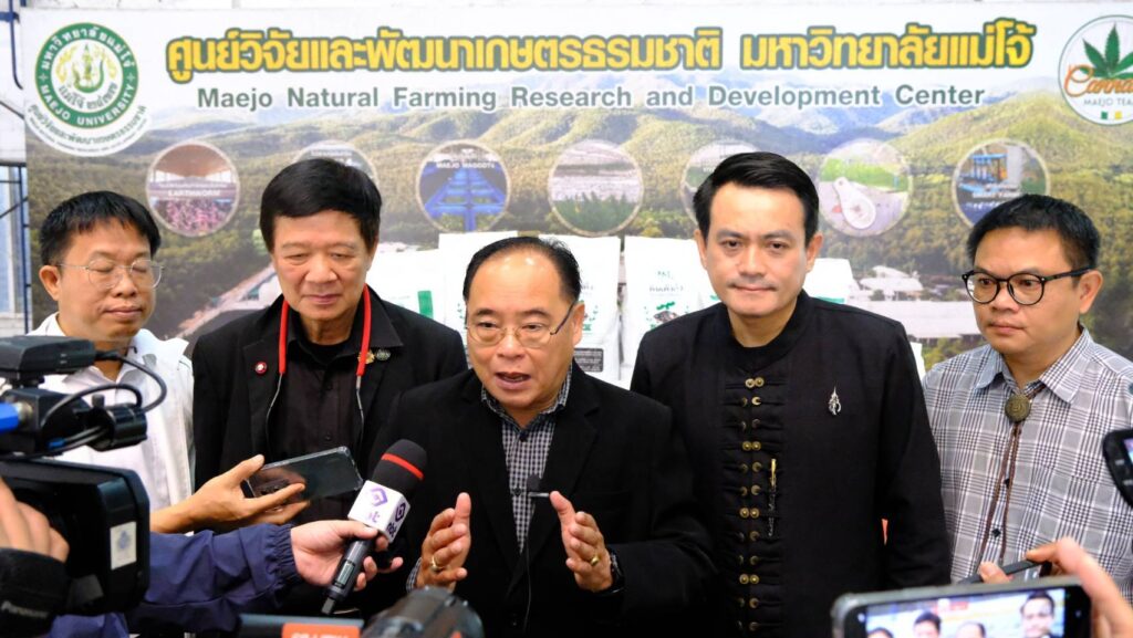 วันที่ 4 มีนาคม 2569 ที่ศูนย์วิจัยและพัฒนาเกษตรธรรมชาติ มหาวิทยาลัยแม่โจ้ รองศาสตราจารย์ ดร. วีระพล ทองมา อธิการบดีมหาวิทยาลัยแม่โจ้ พร้อมด้วยศาสตราจารย์ ดร.อานัฐ ตันโช ผู้อำนวยการศูนย์วิจัยและพัฒนาเกษตรธรรมชาติ มหาวิทยาลัยแม่โจ้ ได้เปิดแถลงข่าว การพัฒนา นวัตกรรมการผลิต ดินพรีเมียม หรือ ดินเด้งดึ๋ง นวัตกรรมใหม่ในการพัฒนาการผลิตดินพร้อมปลูกที่ผลิตจากดินอินทรีย์ 100 %ของศูนย์วิจัยและพัฒนาเกษตรธรรมชาติ มหาวิทยาลัยแม่โจ้