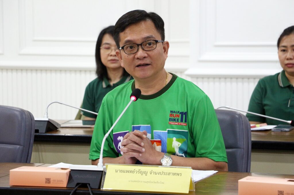 วันนี้ (4 มิ.ย. 68) ที่ห้องประชุม 1 ชั้น 2 อาคารอำนวยการ ศาลากลางจังหวัดเชียงใหม่ นายแพทย์วรัญญู จำนงประสาทพร นายแพทย์สาธารณสุขจังหวัดเชียงใหม่ ได้เชิญชวนประชาชนผ่านการแถลงข่าวสื่อมวลชนจังหวัดเชียงใหม่ ครั้งที่ 16 ร่วมออกกำลังกาย ในโครงการ “แสงนำใจไทยทั้งชาติ เดิน วิ่ง ปั่น ป้องกันอัมพาต เฉลิมพระเกียรติ” ครั้งที่ 11 ซึ่งเป็นโครงการที่จัดขึ้น เพื่อเฉลิมพระเกียรติพระบาทสมเด็จพระเจ้าอยู่หัวและสมเด็จพระนางเจ้าฯ พระบรมราชินี พร้อมทั้งเพื่อให้ประชาชนชาวไทยได้ตระหนักถึงความสำคัญของการป้องกันโรคหลอดเลือดสมอง และรณรงค์เชิญชวนประชาชนทุกเพศทุกวัยได้ออกกำลังกายง่ายๆ ให้สุขภาพดี
