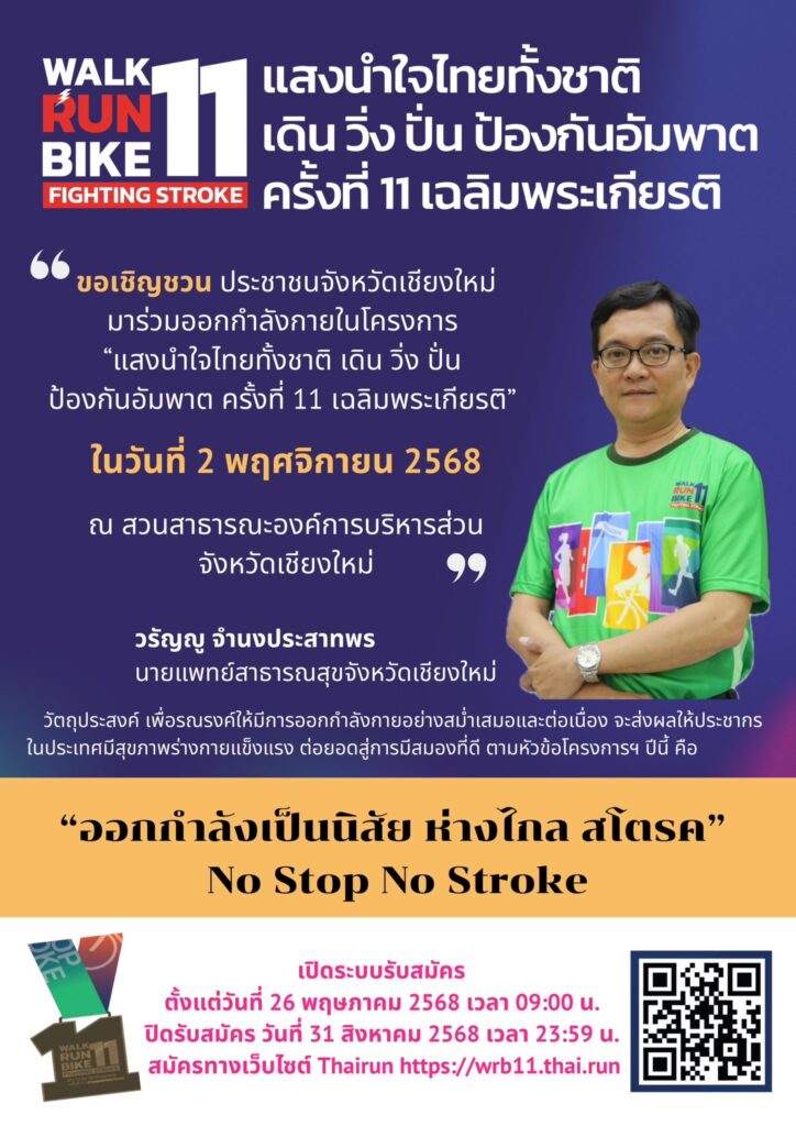 เชียงใหม่-สสจ.เชียงใหม่ ชวน ประชาชนร่วมออกกำลังกาย ในโครงการ “แสงนำใจไทยทั้งชาติ เดิน วิ่ง ปั่น ป้องกันอัมพาต เฉลิมพระเกียรติ” ครั้งที่ 11