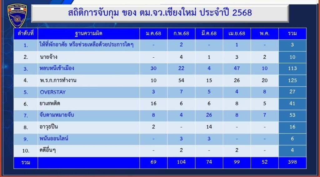 พันตำรวจเอกสุรชัย เอี่ยมผึ้ง ผู้กำกับการตำรวจตรวจคนเข้าเมืองจังหวัดเชียงใหม่ ได้สรุปผลการจับกุมของตำรวจตรวจคนเข้าเมืองจังหวัดเชียงใหม่ ในรอบ 5 เดือน ตั้งแต่ มกราคม ถึงพฤษภาคม 2568 แบ่งเป็นการจับกุมจำนวน 10 คดี คดีแรก ให้ที่พักหรือช่วยด้วยประการใดๆ ผลจับกุมได้ผู้ต้องหา 3 ราย เป็นเกือนกุมภาพันธ์ 2 ราย และเมษายน 2568 จำนวน 1 ราย ,คดีที่ 2 นายจ้าง จับกุมได้จำนวน 10 ราย เป็นเดือน กุมภาพันธ์ จำนวน 4 ราย ,มีนาคม จำนวน 1 ราย ,เมษายนจำนวน 3 ราย และพฤษภาคคม 2568 จำนวน 2 ราย ,คดีที่ 3 หลบหนีเข้าเมือง จับกุมได้ 113 ราย เป็นมกราคมจำนวน 30 ราย