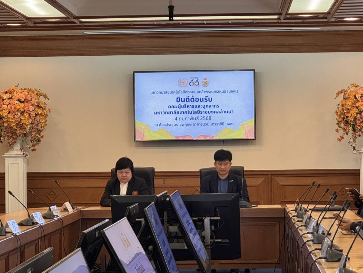 วันที่ 4 กุมภาพันธ์ 2568 รองศาสตราจารย์ ดร.อุเทน คำน่าน รักษาราชการแทน อธิการบดี พร้อมคณะผู้บริหาร มหาวิทยาลัยเทคโนโลยีราชมงคลล้านนา ประชุมร่วมกับมหาวิทยาลัยเทคโนโลยีพระจอมเกล้าพระนครเหนือ เพื่อหารือแนวทาง ความร่วมมือทางวิชาการ งานวิจัย และนวัตกรรม อันจะนำไปสู่การพัฒนาศักยภาพบุคลากรและการตอบโจทย์ภาคอุตสาหกรรม โดย ศาสตราจารย์ ดร.เสาวณิต สุขภารังษี รองอธิการบดีฝ่ายวิชาการ มหาวิทยาลัยเทคโนโลยีพระจอมเกล้าพระนครเหนือ พร้อมคณะผู้บริหารร่วมให้การการต้อนรับ พร้อมทั้งร่วมประชุมแลกเปลี่ยนแนวทางความร่วมมือระหว่างสองมหาวิทยาลัย โดยมุ่งเน้นการพัฒนา ต่อยอดความร่วมมืองานวิจัย เทคโนโลยี และนวัตกรรม เพื่อเสริมสร้างศักยภาพทางการศึกษาและตอบโจทย์ความต้องการของภาคอุตสาหกรรม ณ ห้องประชุมราชพฤกษ์ อาคารนวมินทรราชินี มหาวิทยาลัยเทคโนโลยีพระจอมเกล้าพระนครเหนือ