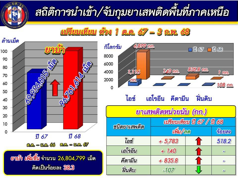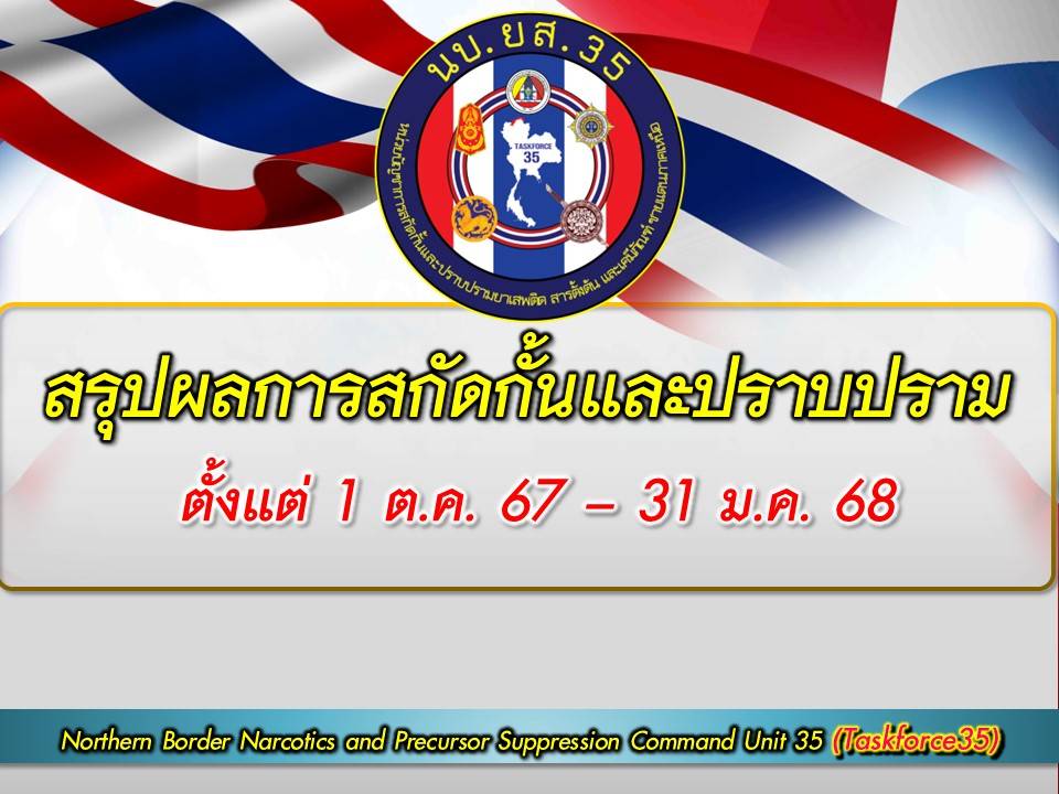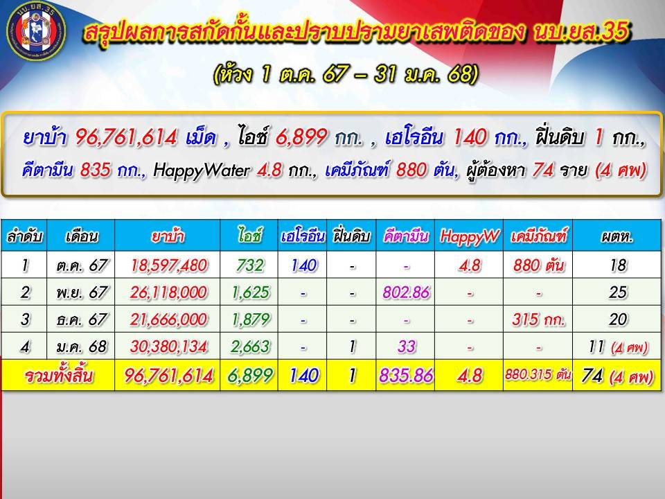 โดย ผลการปฏิบัติการสกัดกั้นยาเสพติด ในห้วง 4 เดือนที่ผ่านมาในพื้นที่รับผิดชอบของ นบ.ยส.35 (1 ต.ค.67 – 3 ก.พ.68) มี 71 เหตุการณ์สำคัญ, เป็นการปะทะกับกลุ่มขบวนการ 14 ครั้ง, ตรวจยึด/จับกุม 57 ครั้ง (ติดตามจับกุมนอกพื้นที่ 3 ครั้ง) ของกลางยาเสพติด
