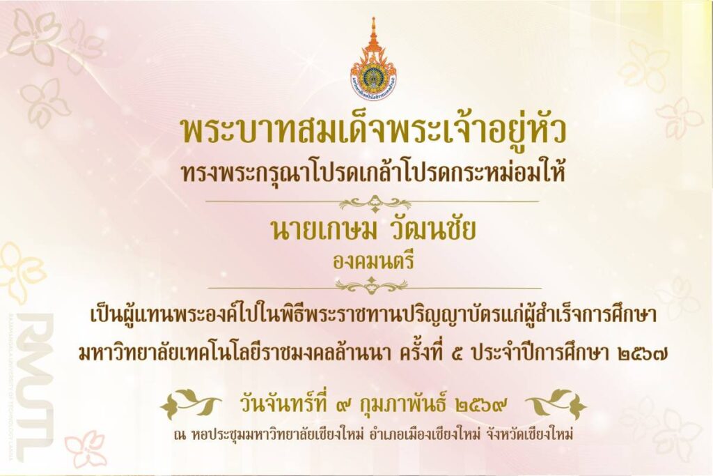 เชียงใหม่-พระบาทสมเด็จพระเจ้าอยู่หัว ทรงพระกรุณาโปรดเกล้าโปรดกระหม่อมให้ นายเกษม วัฒนชัย องคมนตรี เป็นผู้แทนพระองค์ ไปมอบปริญญาบัตรแก่ผู้สำเร็จการศึกษา จากมหาวิทยาลัยเทคโนโลยีราชมงคลล้านนาประจำปีการศึกษา 2567