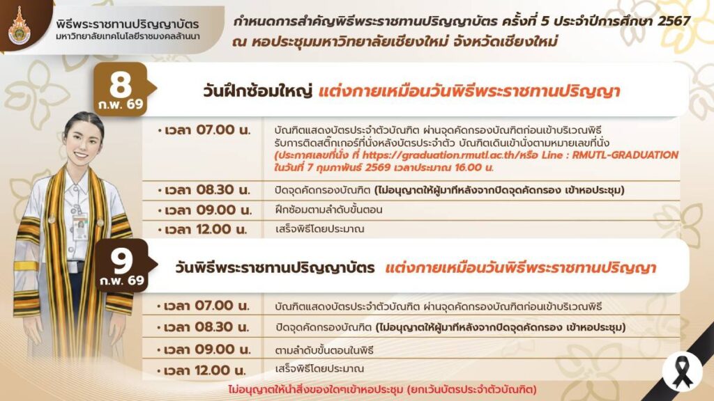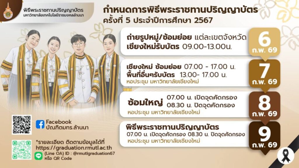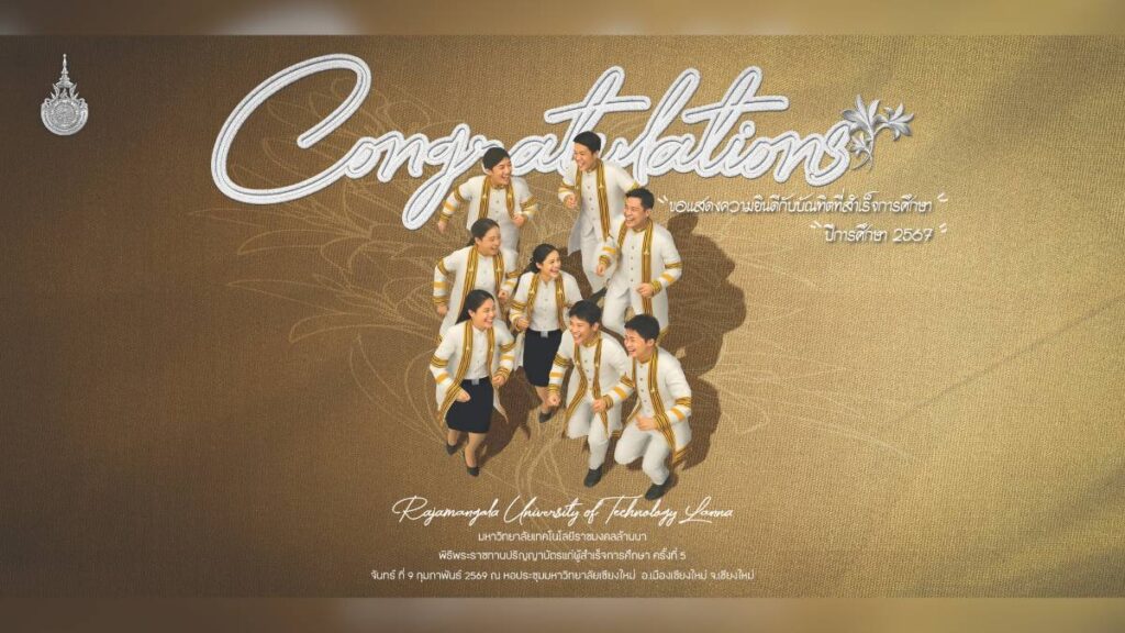 วันจันทร์ที่ 9 กุมภาพันธ์ 2569 ในปีนี้ สภามหาวิทยาลัยเทคโนโลยีราชมงคลล้านนา มีมติมอบปริญญา