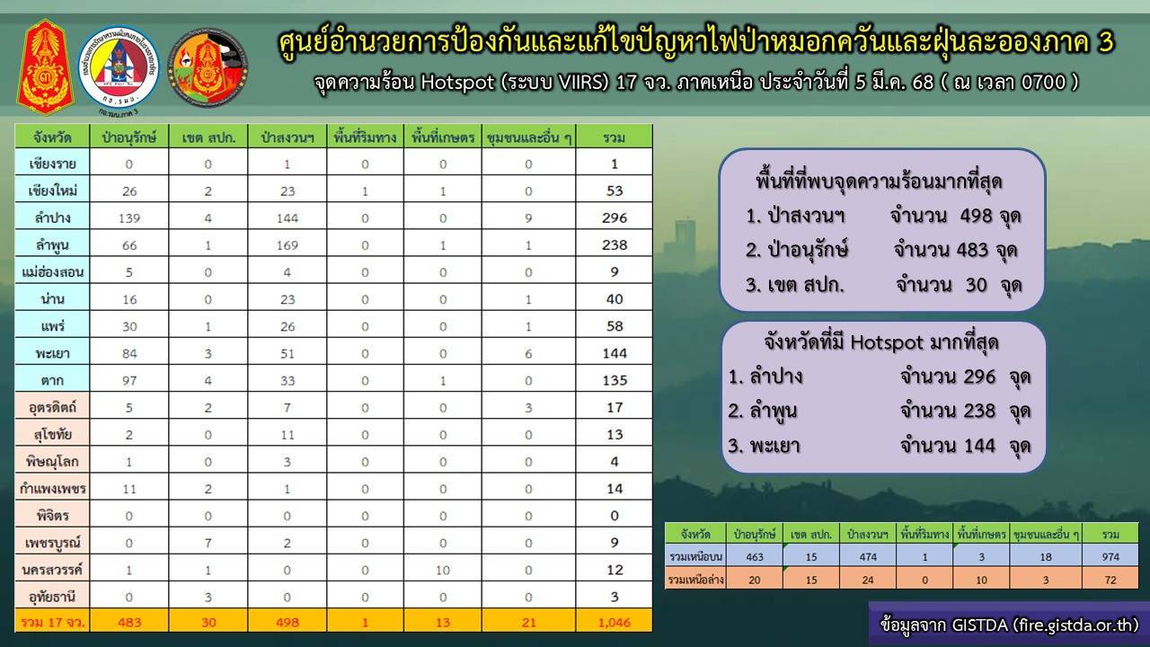 วันที่ 5 มีนาคม 2568 ที่ ศอ.ปกป.ภาค 3 สน. อ.แม่ริม จังหวัดเชียงใหม่ พลตรีชายแดน กฤษณสุวรรณ รองผู้อำนวยการศูนย์อำนวยการป้องกันและแก้ไขปัญหาไฟป่าหมอกควันและฝุ่นละอองภาค 3 เปิดเผยว่า จากการติดตาม สถานการณ์ไฟป่าหมอกควันและฝุ่นละอองในพื้นที่ 17 จว.ภาคเหนือ เช้าวันนี้พบว่าเกิดจุดความร้อนจำนวน 1,046 จุด สูงสุดที่จังหวัดลำปาง จำนวน 296 จุด รองลงมาคือจังหวัดลำพูนจำนวน 238 จุด และจังหวัดพะเยาจำนวน 144 จุด ส่วนใหญ่อยู่ในพื้นป่าสงวนฯ ป่าอนุรักษ์ และเขต สปก. ส่งผลให้ค่าฝุ่นละอองขนาดเล็ก เกินเกณฑ์มาตรฐาน จำนวน 12 จังหวัด โดยเฉพาะที่จังหวัดน่าน จังหวัดลำพูนและจังหวัดเชียงราย และเริ่มมีผลต่อสุขภาพของประชาชน