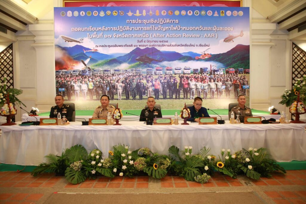วันที่ 5 มิถุนายน 2568 เวลา 09.00 น.พลโท กิตติพงษ์ แจ่มสุวรรณ แม่ทัพภาคที่ 3 และศูนย์อำนวยการป้องกันและแก้ไขปัญหาไฟป่าหมอกควันและฝุ่นละอองภาค 3 เป็นประธานเปิดการประชุมเชิงปฏิบัติการถอดบทเรียนหลังการปฏิบัติงานการแก้ไขปัญหาไฟป่าหมอกควันและฝุ่นละอองในพื้นที่ 17 จังหวัดภาคเหนือ หรือ After Action Review (AAR) ที่ หอประชุมเฉลิมพระเกียรติ 80 พรรษา องค์การบริหารส่วนจังหวัดเชียงใหม่ จังหวัดเชียงใหม่ ซึ่งศูนย์อำนวยการป้องกันและแก้ไขปัญหาไฟป่าหมอกควันและฝุ่นละอองภาค 3 ส่วนหน้าจัดขึ้นเพื่อรวบรวมบทเรียนจากการปฏิบัติงานจริงของหน่วยงานที่เกี่ยวข้อง ตลอดฤดูกาลเกิดเหตุไฟป่า หมอกควัน และฝุ่นละอองที่ผ่านมา ซึ่งได้รับความร่วมมือจากทุกภาคส่วนในการบูรณาการแผนงานและทรัพยากร ทำให้ภาพรวมสถานการณ์ในปีนี้ดีขึ้นกว่าปีที่ผ่านมาอย่างมีนัยสำคัญ ผลการดำเนินงานพบว่า จุดความร้อนในพื้นที่ลดลงร้อยละ 28.61 คุณภาพอากาศดีขึ้นร้อยละ 18.58 และจำนวนวันที่ค่าฝุ่นละอองเกินเกณฑ์มาตรฐานลดลงร้อยละ 7.64 ถือเป็นผลลัพธ์ที่น่าพึงพอใจจากความร่วมมืออย่างเต็มที่ของทุกหน่วยงาน อย่างไรก็ตาม ในปีนี้ศูนย์อำนวยการป้องกันและแก้ไขปัญหาไฟป่าหมอกควันและฝุ่นละอองภาค 3 ส่วนหน้าได้จัดทำ