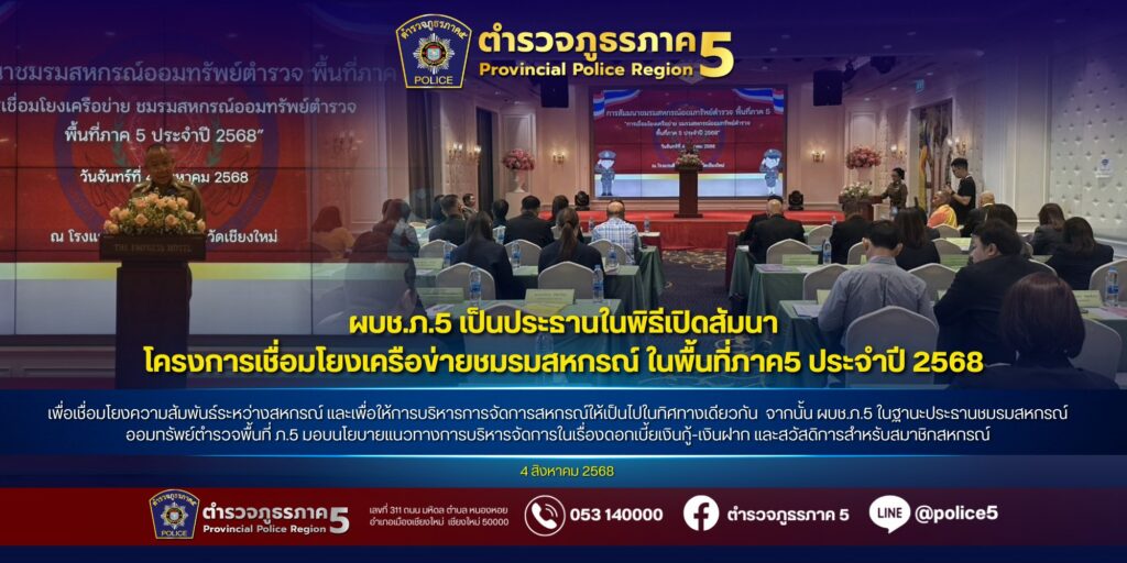 เชียงใหม่-ผบช.ภ.5 เป็นประธานในพิธีเปิด “การสัมมนาโครงการเชื่อมโยงเครือข่ายชมรมสหกรณ์ออมทรัพย์ตำรวจในพื้นที่ภาค 5 ประจำปี 2568” ณ โรงแรมดิเอ็มเพรส จ.เชียงใหม่