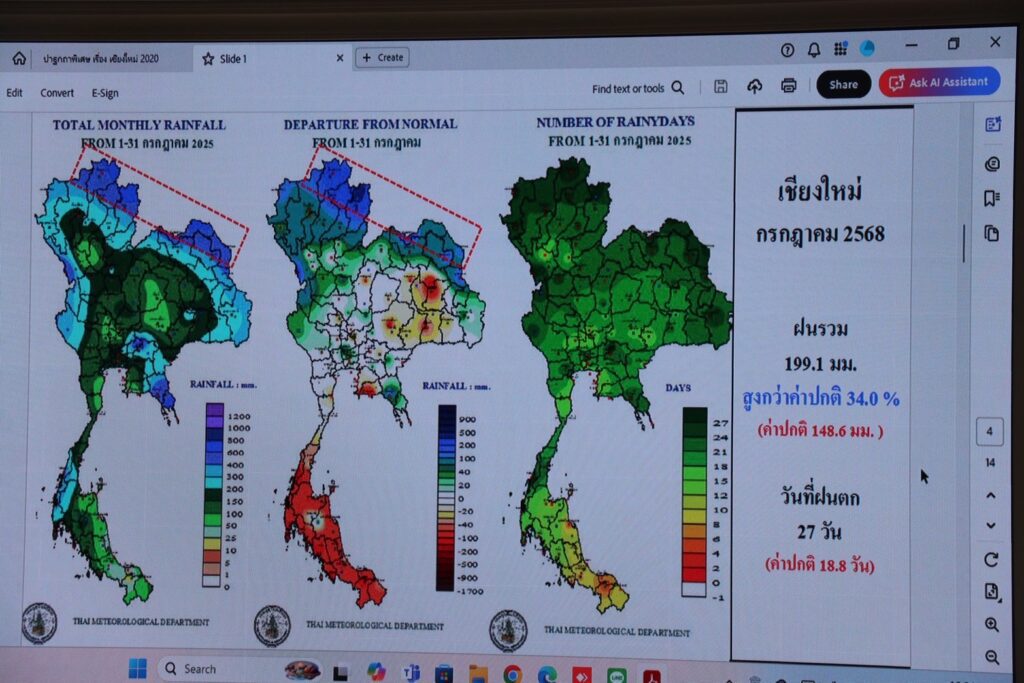 วันนี้ (5 ส.ค. 68) ที่ห้องประชุม 5 ชั้น 5 อาคารอำนวยการ ศาลากลางจังหวัดเชียงใหม่ นายสุกฤษฎิ์ เกิดแสง ผู้อำนวยการศูนย์อุตุนิยมวิทยาภาคเหนือ คาดหมายลักษณะอากาศในเดือนสิงหาคม ว่าโดยปกติช่วงนี้จะมีฝนตกชุก แต่ในปีนี้ 2 สัปดาห์แรกของเดือนสิงหาคมฝนจะลดน้อยลงกว่าค่าปกติ จากนั้นจะมีฝนเพิ่มขึ้นจากร่องมรสุมที่เคลื่อนกลับเข้ามาในพื้นที่ภาคเหนือ ทำให้ช่วงวันที่ 11-17 สิงหาคม ฝนใกล้เคียงค่าปกติ โดยในส่วนของจังหวัดเชียงใหม่ จะเริ่มมีฝนมากขึ้นในช่วงวันที่ 12 สิงหาคม ซึ่งเป็นช่วงหยุดยาววันแม่ จึงขอให้ประชาชนและนักท่องเที่ยวที่เดินทางด้วยความระมัดระวังและเตรียมความพร้อมรับสถานการณ์ฝนด้วย ส่วนในช่วง 2 สัปดาห์สุดท้ายของเดือนสิงหาคม จะต้องเฝ้าระวังพายุหมุนเขตร้อนที่มีแนวโน้มเคลื่อนผ่านภาคเหนือและภาคอีสาน ซึ่งจะทำให้มีฝนตกเพิ่มขึ้นอีก