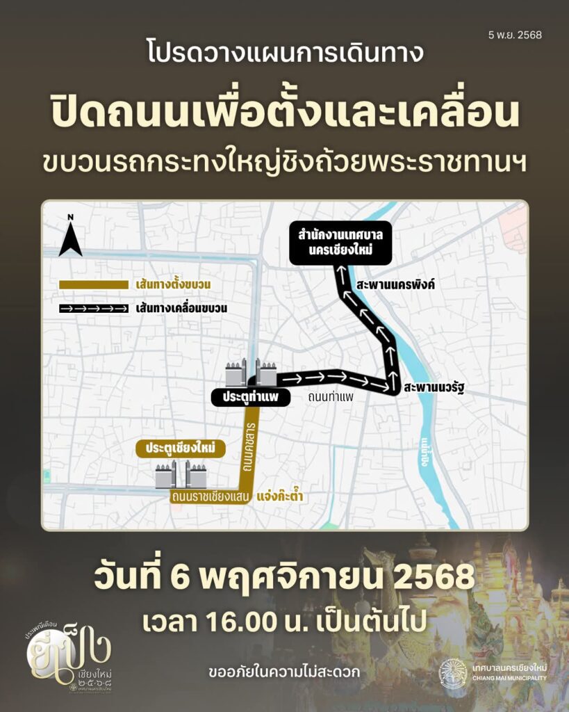 เทศบาลนครเชียงใหม่ ขอแจ้งปิดถนนเพื่อตั้งและเคลื่อนขบวนรถกระทงใหญ่ ชิงถ้วยพระราชทานฯ