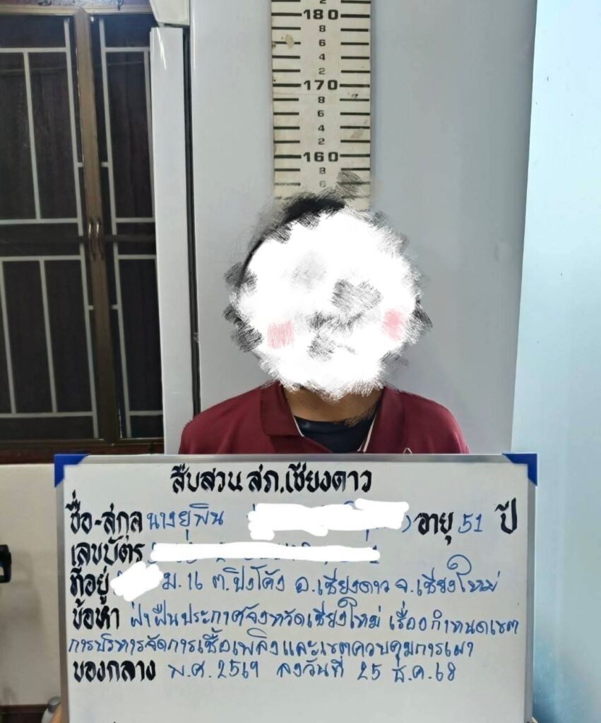 เมื่อไปถึงบริเวณไร่ดังกล่าว พบ นางยุพิน ฯ อายุ 51 ปี ราษฎรหมู่ 16 ตำบลปิงโค้ง อำเภอเชียงดาว จังหวัดเชียงใหม่ ยืนควบคุมการเผาบริเวณดังกล่าว ชุดจับกุมจึงได้แสดงตัวเป็นเจ้าหน้าที่ และได้สอบถามนางยุพินฯ ซึ่งรับว่า ตนเป็นผู้จุดไฟเผาจริง ชุดจับกุมจึงได้แจ้งข้อกล่าวหา เผาในที่โล่งโดยฝ่าฝืนประกาศจังหวัดเชียงใหม่ เรื่อง กำหนดเขตการบริหารจัดการเชื้อเพลิงและเขตควบคุมการเผาของจังหวัดเชียงใหม่ ประจำปีงบประมาณ พ.ศ. 2569 จากนั้นได้นำตัวนางยุพินฯ ส่งพนักงานสอบสวน สภ.เชียงดาว เพื่อดำเนินการต่อไป
