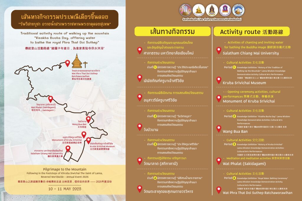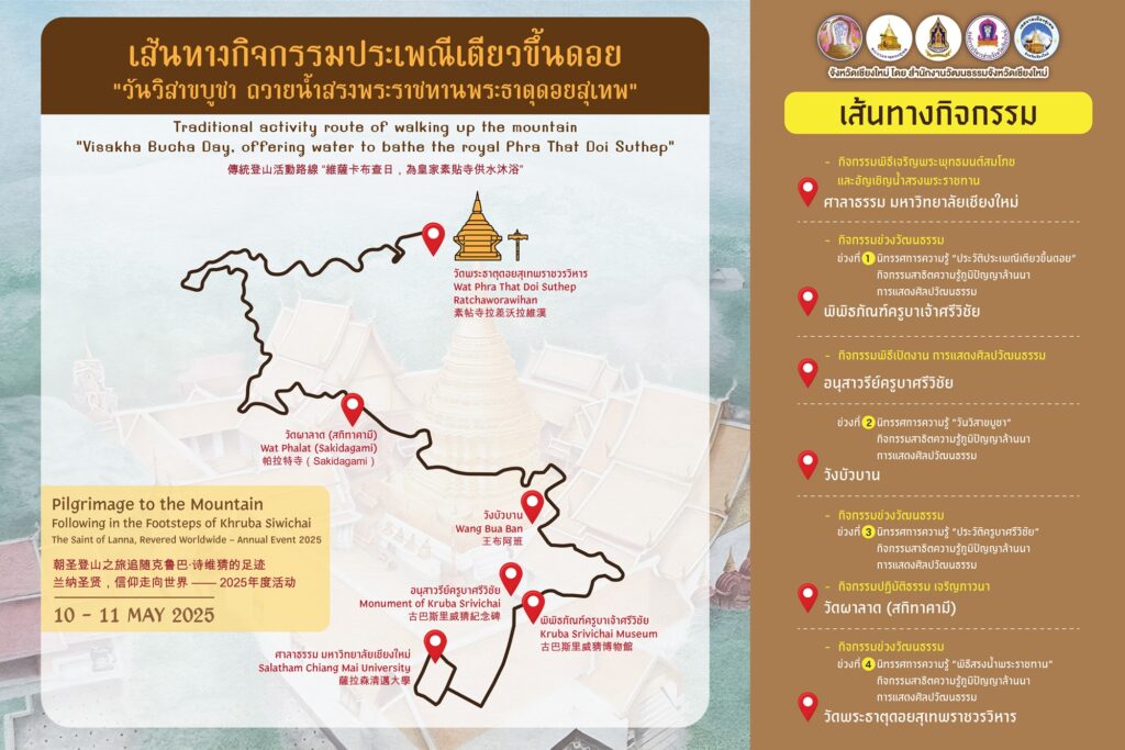 โดยในช่วงเช้าวันเสาร์ที่ 10 พฤษภาคม 2568 จะมีการจัดกิจกรรมปฎิบัติธรรมเจริญภาวนา ณ วัดผาลาด จากนั้นในช่วงเย็นตั้งแต่เวลา 17:00 น. เป็นต้นไป จะมีการจัดพิธีเจริญพระพุทธมนต์สมโภช ขบวนอัญเชิญนำส่งพระพระราชทาน โดยเริ่มต้นจากศาลาธรรม มหาวิทยาลัยเชียงใหม่ จนถึงบริเวณลานครูบาศรีวิชัย พร้อมทั้งมีการจัดข่วงวัฒนธรรมตลอดเส้นทางการเตรียมขึ้นดอย นอกจากนี้ยังมีกิจกรรมพาสปอร์ต เป็นการเช็คอินตามจุดต่างๆเพื่อรับเหรียญครูบาศรีวิชัยเป็นของที่ระลึก ส่วนในวันวันอาทิตย์ที่ 11 พฤษภาคม 2568 ก็จะมีพิธีทำบุญตักบาตรพระสงฆ์สามเณรและพิธีสรงน้ำพระราชทานพระบรมธาตุดอยสุเทพ