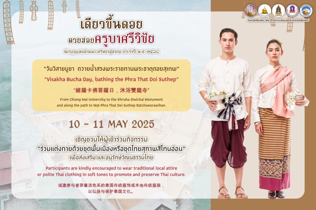 ขอเชิญชวนทุกท่านการแต่งกายด้วยชุดพื้นเมืองหรือชุดโทนสีอ่อน ร่วมกิจกรรม “ประเพณีเตียวขึ้นดอย ตวยฮอยครูบาศรีวิชัย นักบุญแห่งล้านนา ศรัทธาสู่สากล” ประจำปี 2568 ในวันที่ 10-11 พฤษภาคม 2568 นี้ เพื่อความเป็นสิริมงคลต่อชีวิต