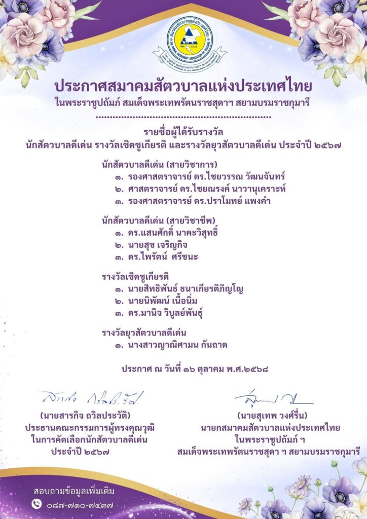 สำหรับรางวัลยุวสัตวบาลดีเด่น เป็นรางวัลที่มอบให้แก่นิสิตนักศึกษาที่มีความรู้ ความสามารถ และมีผลงานโดดเด่นด้านวิชาการและวิชาชีพสัตวบาล รวมถึงมีจิตอาสาและคุณธรรมจริยธรรมอันเหมาะสม ถือเป็นรางวัลเกียรติยศอันทรงคุณค่าและเป็นกำลังใจสำคัญให้กับเยาวชนในสายวิชาชีพสัตวบาล