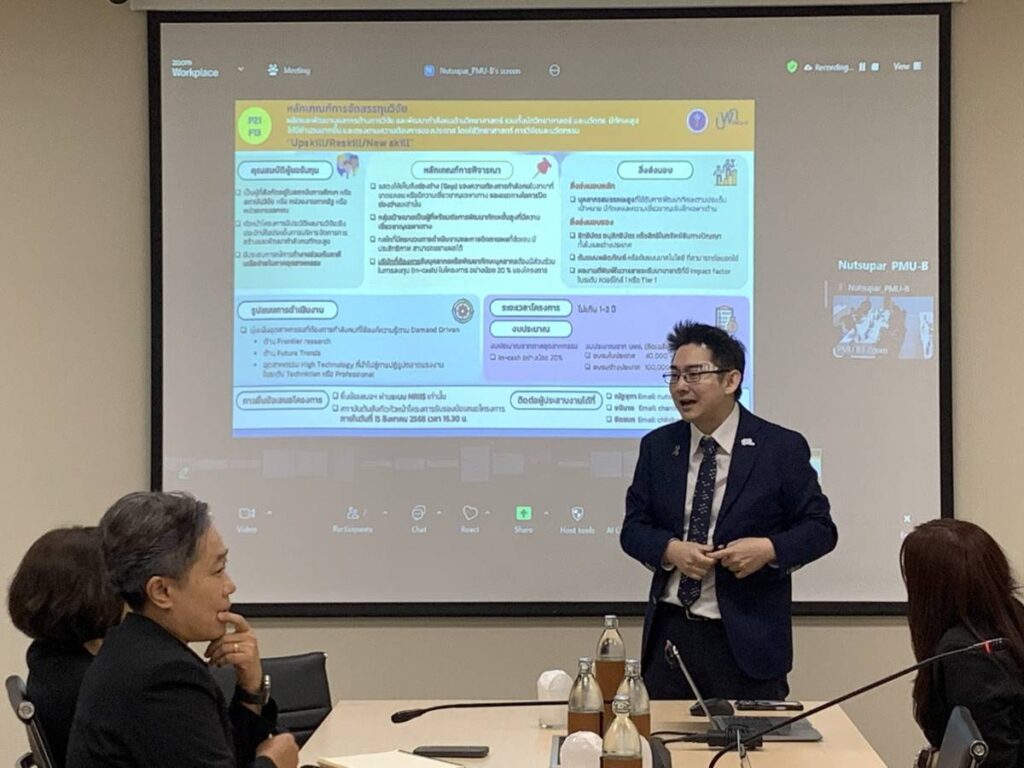 จากนั้นเข้าประชุมรับมอบนโยบายและแนวทางการทำวิจัยสำหรับมหาวิทยาลัยกลุ่มที่ 2 จาก ดร.ณิรวัฒน์ ธรรมจักร์ ผู้อำนวยการหน่วยบริหารและจัดการทุนด้านการพัฒนากำลังคน และทุนด้านการพัฒนาสถาบันอุดมศึกษา การวิจัยและการสร้างนวัตกรรม (บพค.) เพื่อหารือถึงทิศทางการสนับสนุนทุนวิจัยที่เน้นการพัฒนาทรัพยากรมนุษย์ซึ่งเป็นหัวใจสำคัญของการขับเคลื่อนประเทศ ในการ “สร้างและพัฒนาคน” ในสาขาที่จำเป็นเร่งด่วนตามยุทธศาสตร์ชาติ เพื่อสร้างบุคลากรที่มีความเชี่ยวชาญเฉพาะทางการพัฒนาสถาบัน สนับสนุนทุนด้านการพัฒนาสถาบันอุดมศึกษาให้มีความเข้มแข็งทางวิชาการ การยกระดับโครงสร้างพื้นฐาน: สนับสนุนงบประมาณด้านเครื่องมือวิทยาศาสตร์ เทคโนโลยี และโครงสร้างพื้นฐานการวิจัย ให้ทันสมัย รองรับการสร้างนวัตกรรมขั้นสูงต่อไป ณ สำนักงานสภานโยบายการอุดมศึกษา วิทยาศาสตร์ วิจัยและ นวัตกรรมแห่งชาติ (สอวช.) กรุงเทพมหานคร