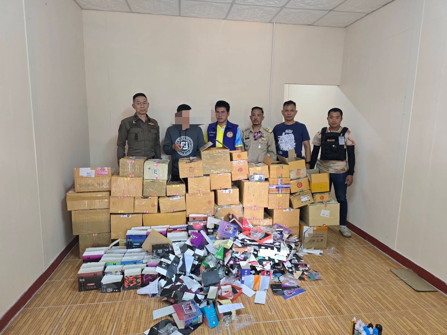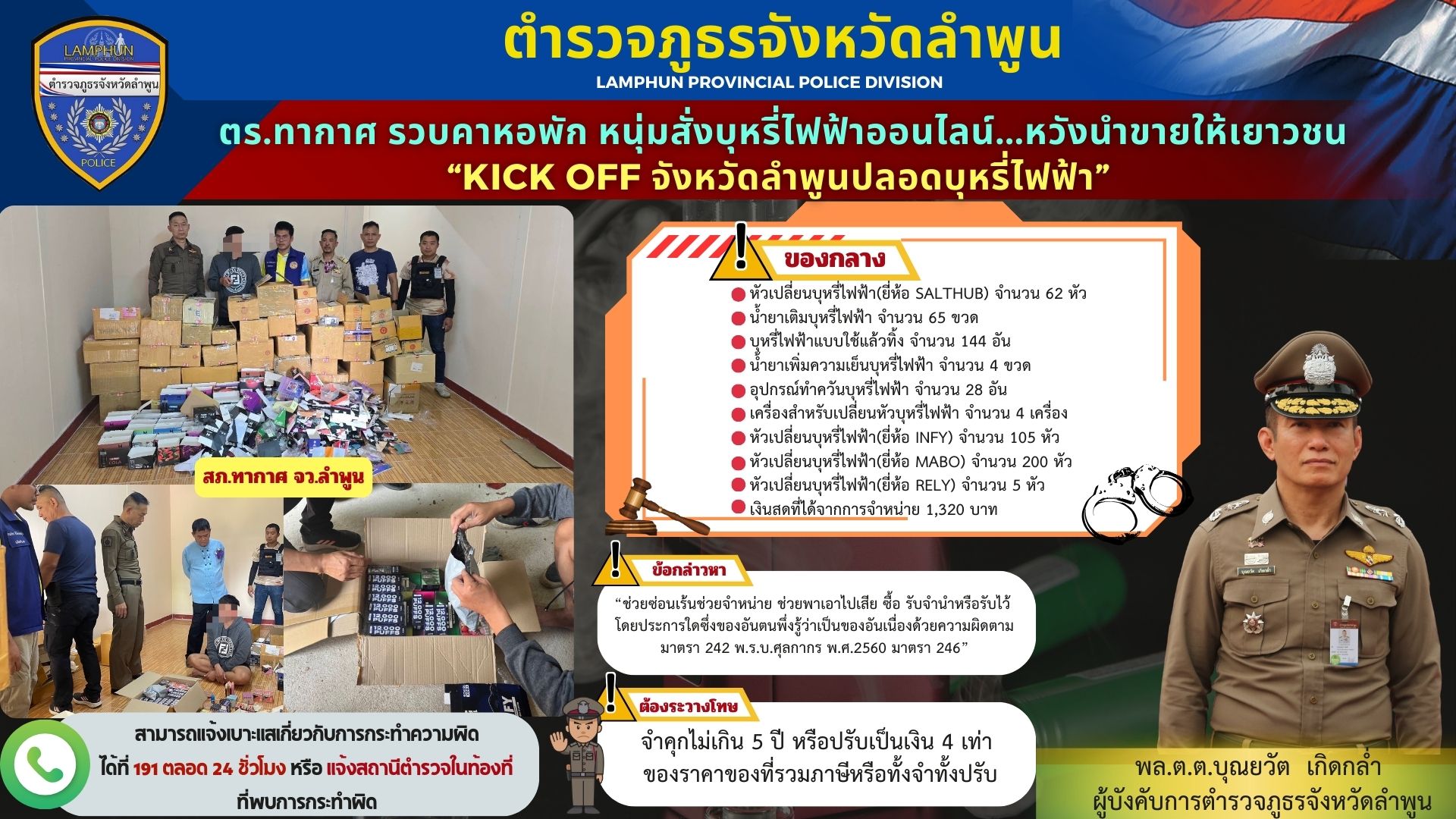 ตร.ทากาศ รวบคาหอพัก หนุ่มสั่งบุหรี่ไฟฟ้าออนไลน์ หวังนำขายให้เยาวชน ตรวจยึดของกลางกว่า 600 รายการ “KICK OFF จังหวัดลำพูนปลอดบุหรี่ไฟฟ้า”