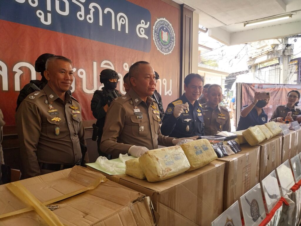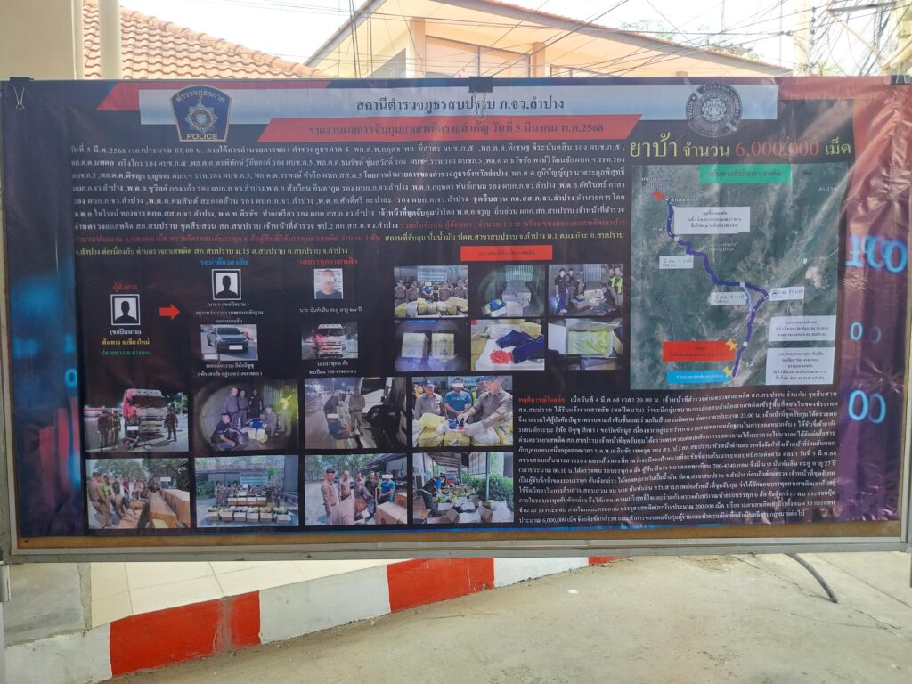 เมื่อวันที่ 7 มี.ค.68 ที่ลานแถลงข่าว อาคารกองบังคับการสืบสวนสอบสวน ตำรวจภูธรภาค 5 อ.เมืองเชียงใหม่ จ.เชียงใหม่ พล.ต.ท.กฤตธาพล ยี่สาคร ผบช.ภ.5, พล.ต.ต.พิเชษฐ จีระนันตสิน, พล.ต.ต.นพดล กรึงไกร, พล.ต.ต.พรพิทักษ์ รู้ยืนยง, พล.ต.ต.ธนะรัชต์ ชุ่มสวัสดิ์, พล.ต.ต.พิชญา บุญขจร, พล.ต.ต.ธวัชชัย พงษ์วิวัฒนชัย รอง ผบช.ภ.5, พล.ต.ต.วรพงศ์ คำลือ ผบก.สส.ภ.5, พล.ต.ต.ภูมิปัญญ์ญา นวตระกูลพิสุทธิ์ ผบก.ภ.จว.ลำปาง และ พล.ต.ต.พงษ์เดช คำใจสู้ ผบก.ภ.จว.แพร่ ฝ่ายทหาร นบ.ยส.35 โดย พล.ท.กิตติพงศ์ ชื่นใจชน มทน.3/ผบ.นบ.ยส.35 สำนักงาน ปปส.ภาค 5 ร่วมแถลงข่าวการจับกุมคดียาเสพติดสภ.สบปราบ จ.ลำปาง จับกุมผู้ต้องหาพร้อมของกลางยาบ้า 6,000,000 เม็ด และสภ.ห้วยไร่ จ.แพร่ ตรวจยึดยาบ้า 996,000 เม็ด