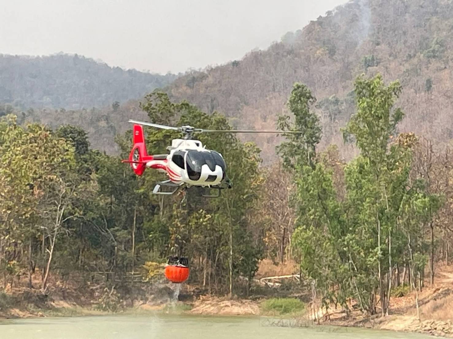เฮลิคอปเตอร์ขึ้นบินสำรวจพื้นที่อำเภอเมืองลำพูน เพื่อสำรวจพื้นที่เผาไหม้-พื้นที่แหล่งน้ำ เสริมกำลังภาคพื้นดินที่เข้าปฏิบัติหน้าที่ดับไฟป่าต่อเนื่อง