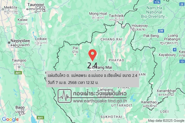 เชียงใหม่-เกิดแผ่นดินไหว วัดได้ 2.4 ลึก 1 ก.ม จุดศูนย์กลาง ต.แม่หอพระ อ.แม่แตง จ.เชียงใหม่