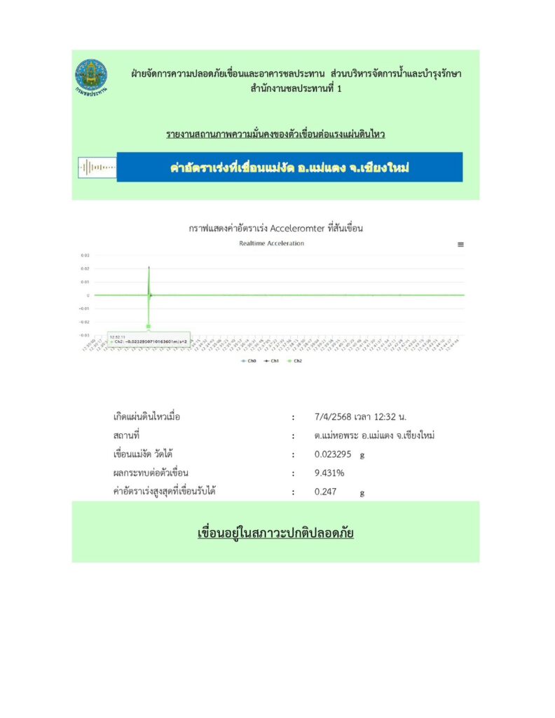 เมื่อวันที่ 7 เมย.2568 เวลา 12.32 น. เกิดแผ่นดินไหว วัดได้ 2.4 ลึก 1 กม. ศูนย์กลาง ต.แม่หอพระ อ.แม่แตง จ.เชียงใหม่ ห่างจากเขื่อนแม่งัดฯ 6 กม. รู้สึกได้ที่เขื่อนแม่งัด จากค่าตรวจวัดพฤติกรรมเขื่อนเขื่อนแม่งัด รับค่าอัตราเร่งได้สูงสุด 0.247 gวัดได้ช่วงเกิดแผ่นดินไหว0.02395 เทียบเป็น 9.431%และการตรวจสอบเขื่อนด้วยสายตายังไม่พบข้อบ่งชี้แลถเกิดความเสียหายต่อตัวเขื่อนแต่อย่างใด