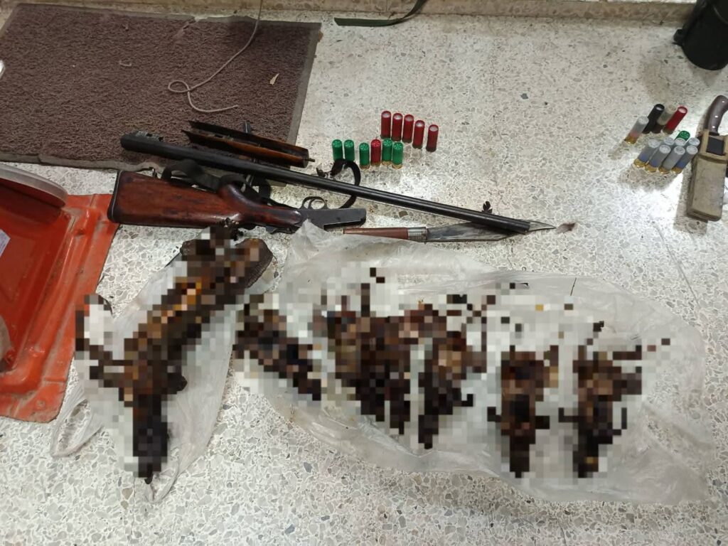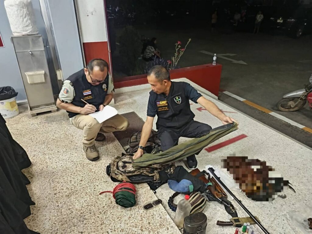 จากการดักซุ่มเมื่อวันที่ 5 เมษายน 2569 เวลาประมาณ 19.30 น. เจ้าหน้าที่พบชายต้องสงสัย 2 ราย ขับขี่รถจักรยานยนต์ไม่ติดแผ่นป้ายทะเบียนออกมาจากชายป่าด้วยท่าทางมีพิรุธ จึงได้แสดงตัวขอตรวจค้น ผลการตรวจสอบพบอาวุธปืนลูกซอง 1 กระบอก พร้อมเครื่องกระสุนขนาดต่างๆ รวม 12 นัด และอุปกรณ์การเดินป่าครบชุด อาทิ แตรล่อไก่ ไฟฉายคาดศีรษะ เปลนอน และเสียม