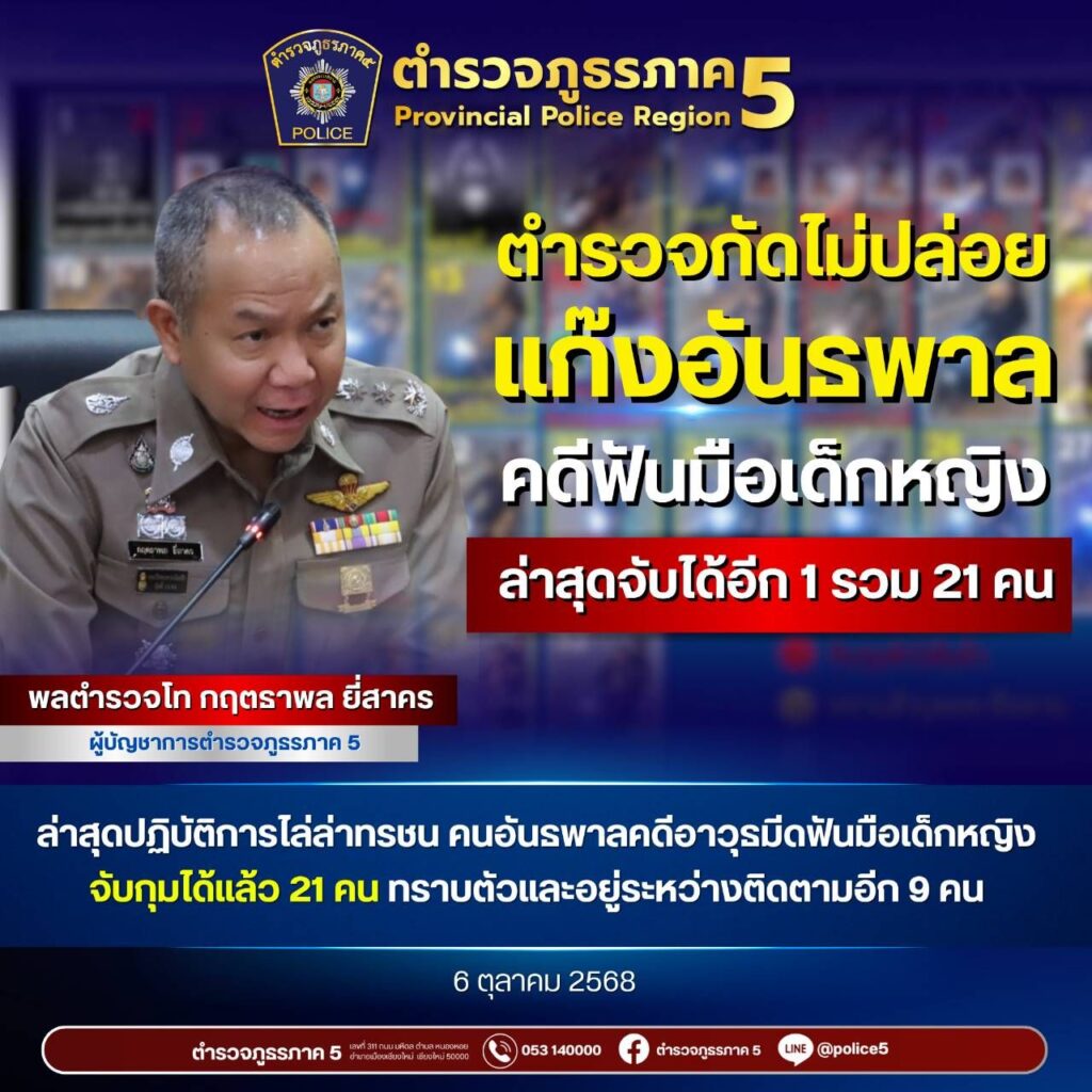 เชียงใหม่-ผบช.ภ.5 เผยผลปฏิบัติการ “ไล่ล่าทรชนคนอันธพาลก่อเหตุฟันมือเด็กหญิงขาด” ล่าสุดจับได้แล้ว 21 คน ทราบตัวและอยู่ระหว่างติดตามจับกุมอีก 9 คน