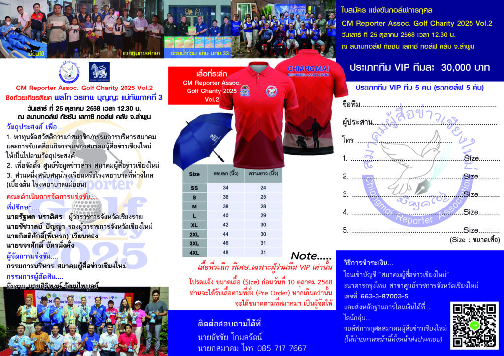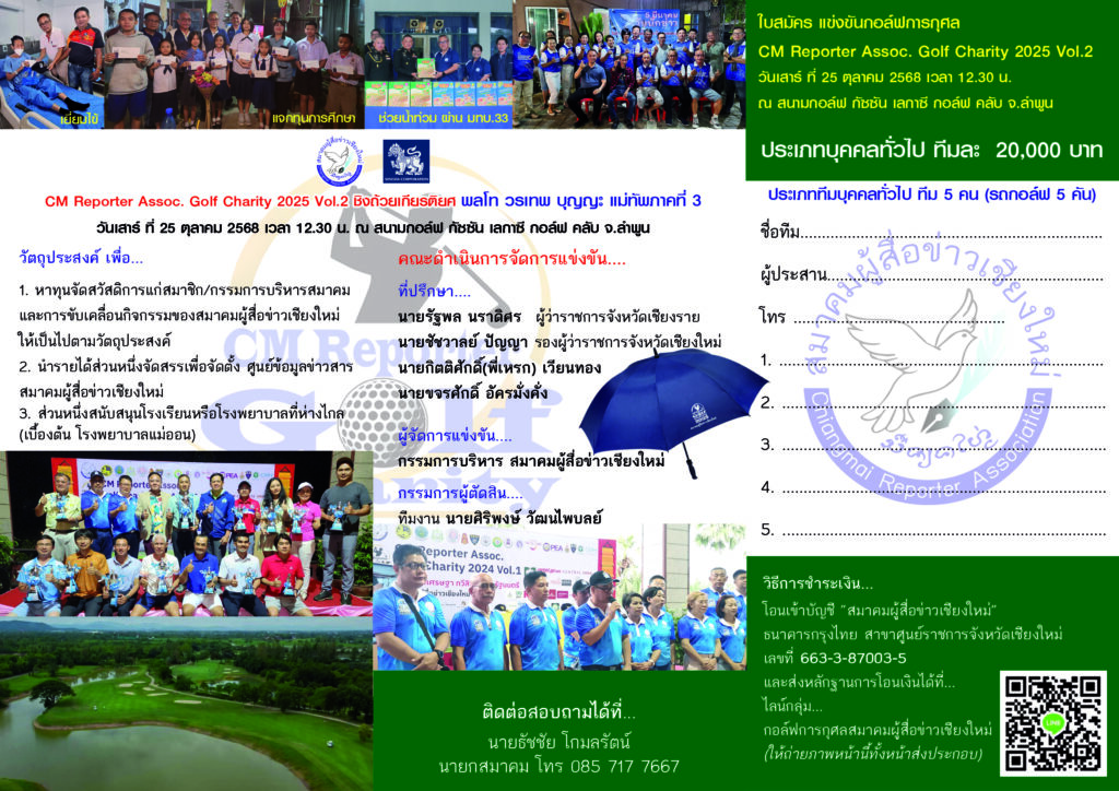 การแข่งขันกอล์ฟการกุศล “สมาคมผู้สื่อข่าวเชียงใหม่” CM Reporter Assoc. Golf Charity 2025 Vol.2 ชิงถ้วยเกียรติยศ พลโท วรเทพ บุญญะ แม่ทัพภาคที่ 3 กำหนดจัดแข่งขันในวันเสาร์ ที่ 25 ตุลาคม 2568 Shot Gun Start เวลา 12.30 น. ณ สนาม กัซซัน เลกาซี่ กอล์ฟคลับ แอนด์ รีสอร์ท ต.บ้านธิ อ.บ้านธิ จ.ลำพูน โดยค่าสมัครการแข่งขัน ประเภทบุคคลทั่วไป ทีม 5 คน ทีมละ 20,000 บาท มีรถกอล์ฟให้ 5 คัน ของที่ระลึก ร่ม 5 คัน และประเภททีม VIP ทีม 5 คน ทีมละ 30,000 บาท มีรถกอล์ฟ 5 คัน ของที่ระลึก ร่ม 5 คัน และเสื้อ CM Reporter Assoc. Golf Charity 2025 Vol.2 สีแดง อีก 5 ตัว
