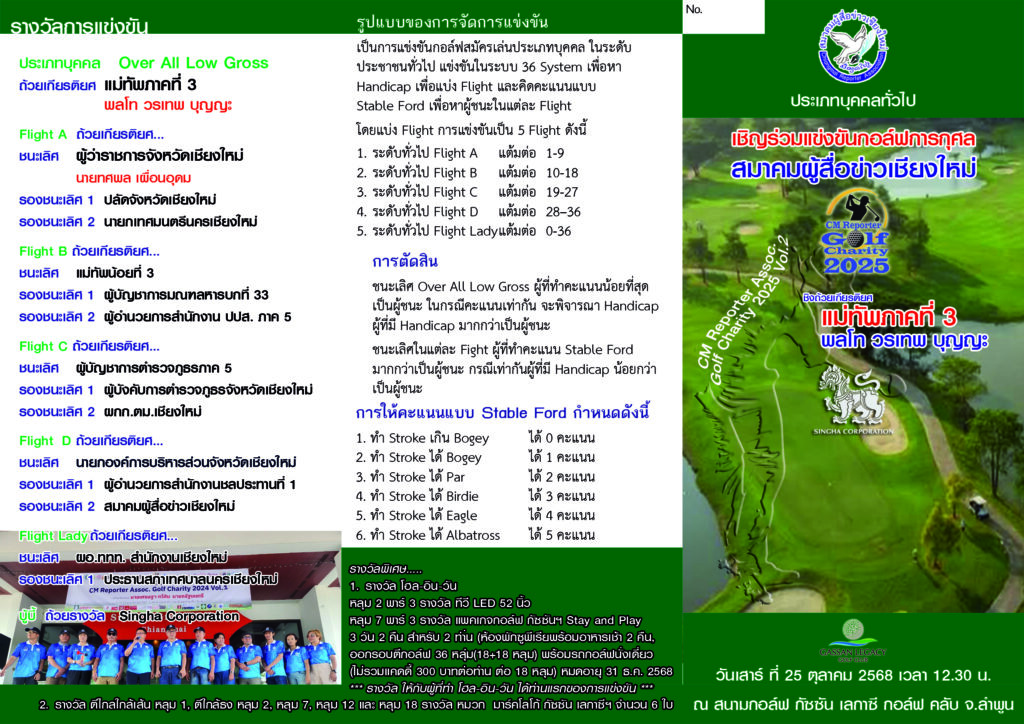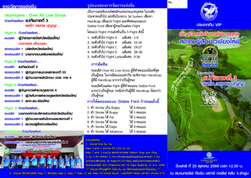สมาคมผู้สื่อข่าวเชียงใหม่ จัดการแข่งขันกอล์ฟการกุศล “สมาคมผู้สื่อข่าวเชียงใหม่” CM Reporter Assoc. Golf Charity 2025 Vol.2 ชิงถ้วยเกียรติยศ พลโท วรเทพ บุญญะ แม่ทัพภาคที่ 3 วันเสาร์ ที่ 25 ตุลาคม 2568 เวลา 12.00 น. ณ สนามกอล์ฟ กัซซัน เลกาซี กอล์ฟ คลับ