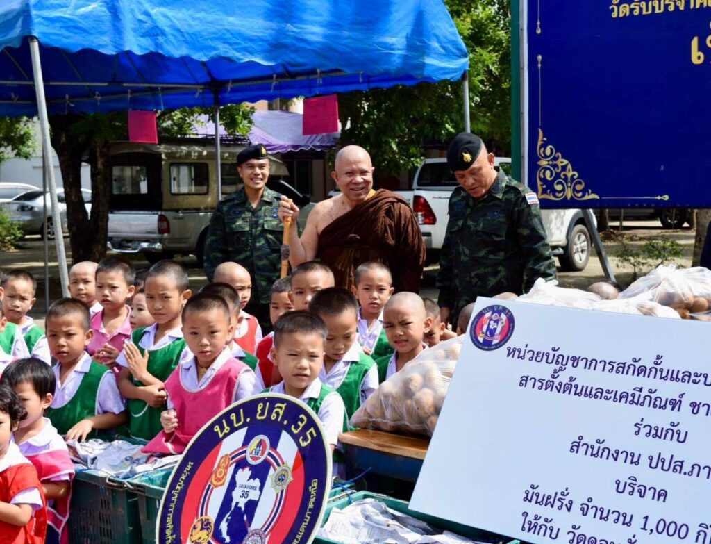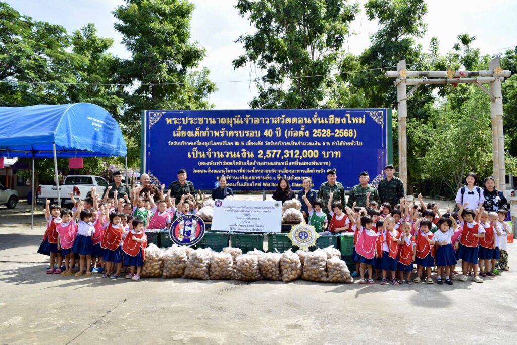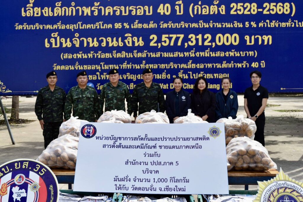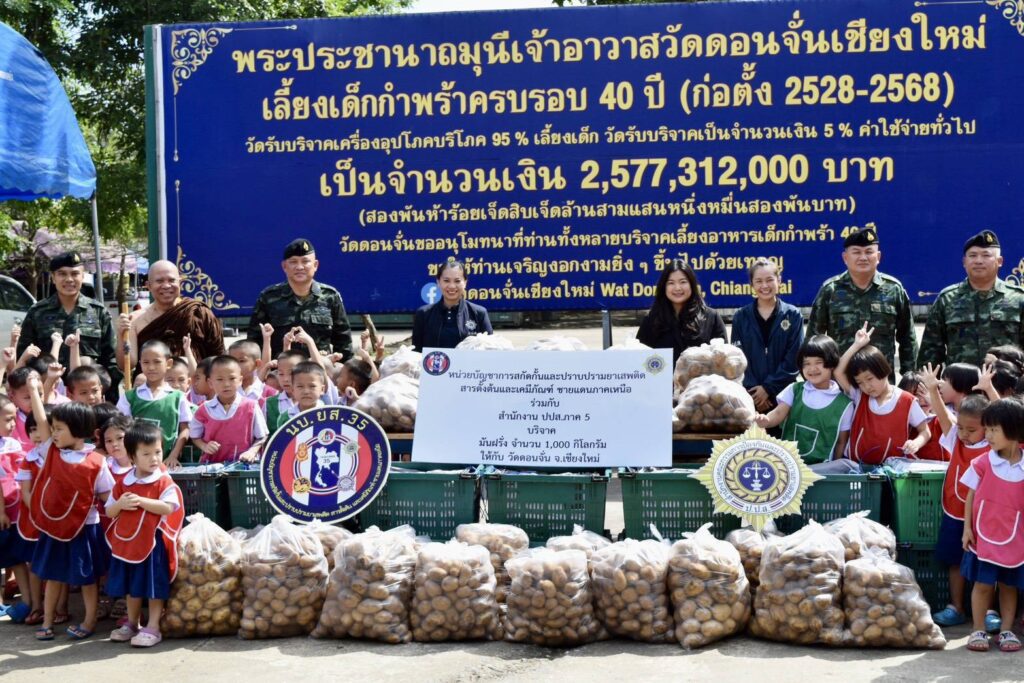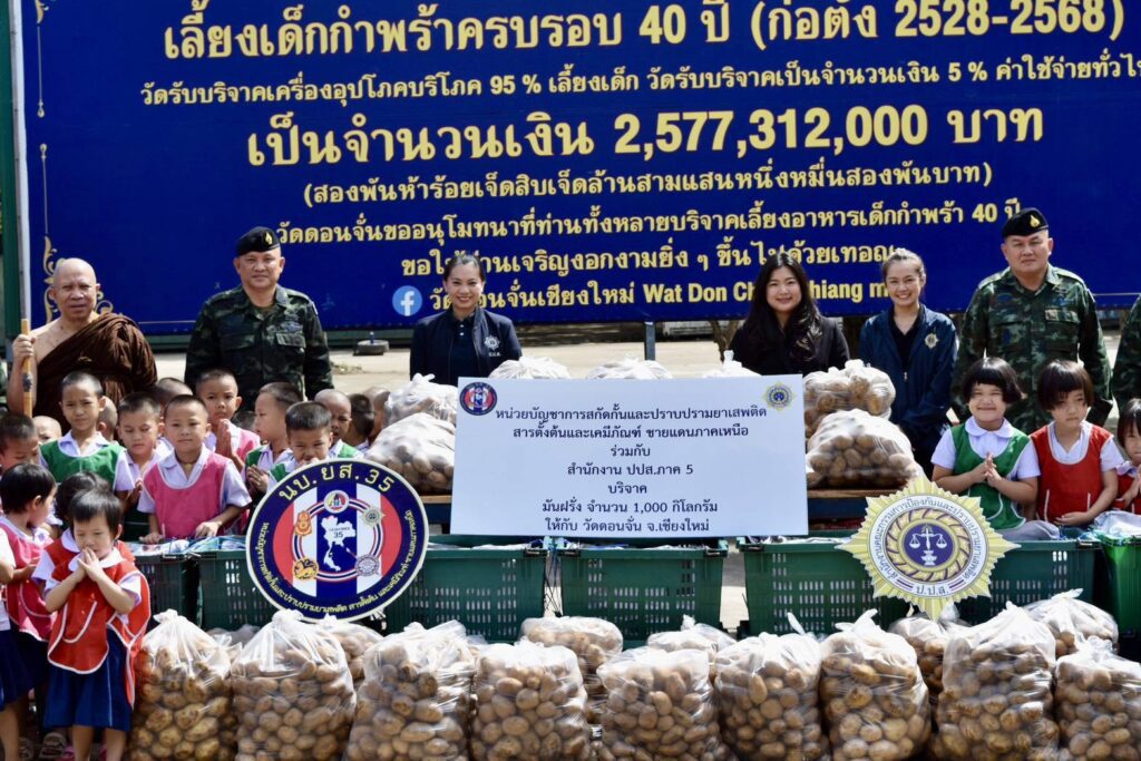 เชียงใหม่-นบ.ยส.35 ร่วมกับ สนง.ปปส.ภาค 5 บริจาคมันฝรั่ง 1,000 กิโลกรัมให้วัดดอนจั่น เพื่อใช้ประกอบอาหารกลางวันสำหรับเด็กด้อยโอกาสกว่า 900 คน หวังสร้างเครือข่ายป้องกันปัญหายาเสพติดให้เยาวชน