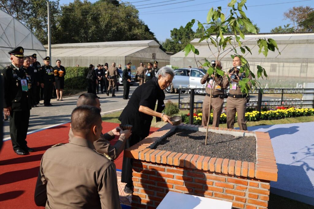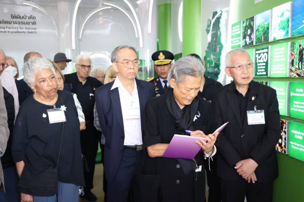 จากนั้น ประทับรถรางพระที่นั่ง ไปยังอาคารศูนย์นวัตกรรมพฤกษเภสัช ทอดพระเนตรแปลงป่าร้อยรักษ์ ซึ่งจำลองการปลูกพืชยา ควบคู่การฟื้นคืนไม้ป่า 100 ต้นในพื้นที่ 1 ไร่ มีพืชสมุนไพร อาทิ อัญชัน พันธุ์เทพรัตน์ไพลิน 63, ตะไคร้หอม, หม่อนใบ, เชียงดา, เพชรสังฆาต, ไพล, ขมิ้นชัน ซึ่งสามารถใช้ประโยชน์ทางยาได้ทุกส่วน โครงการป่ายาชุมชน เริ่มส่งเสริมเกษตรกรปลูกพืชยาร่วมกับป่าครั้งแรกในปี 2567 มีเกษตรกรเข้าร่วมโครงการ 39 ราย มีพื้นที่ปลูกพืชยาร่วมกับไม้ป่ารวม 16 ไร่ และในปี 2568 มีเกษตรกรสนใจเข้าร่วมโครงการ 100 ราย มีพื้นที่ปลูก ประมาณ 43 ไร่ ในปีนี้ มีเป้าหมายให้เกษตรกร เข้าร่วมโครงการ 300 ราย พื้นที่ประมาณ 150 ไร่