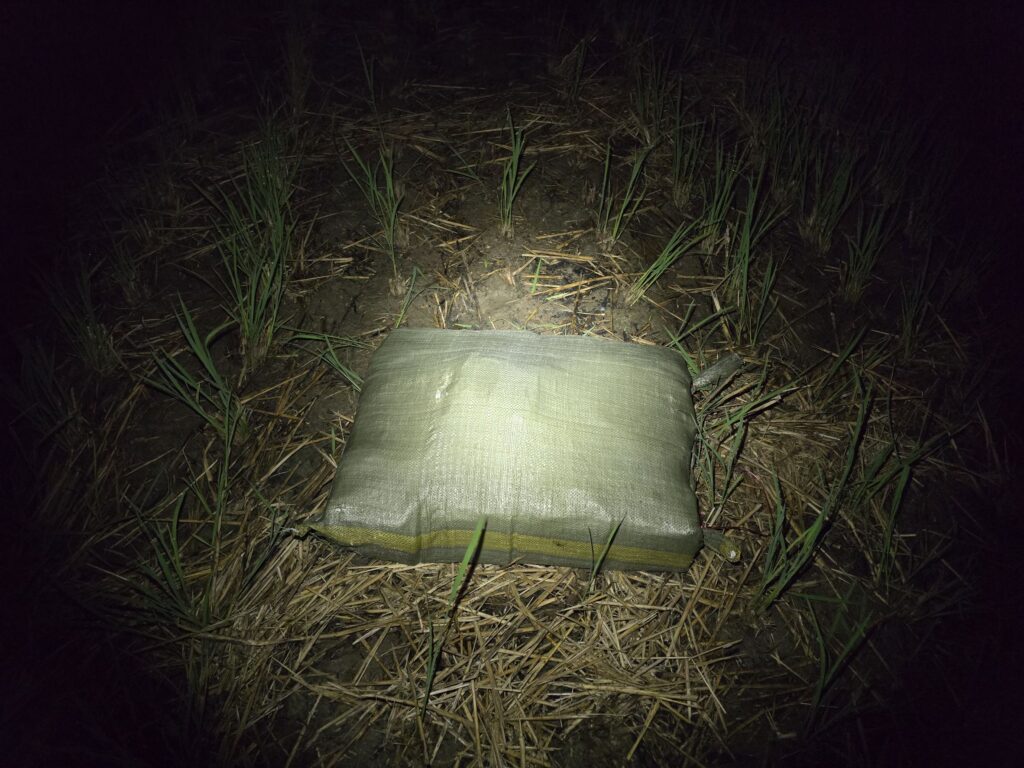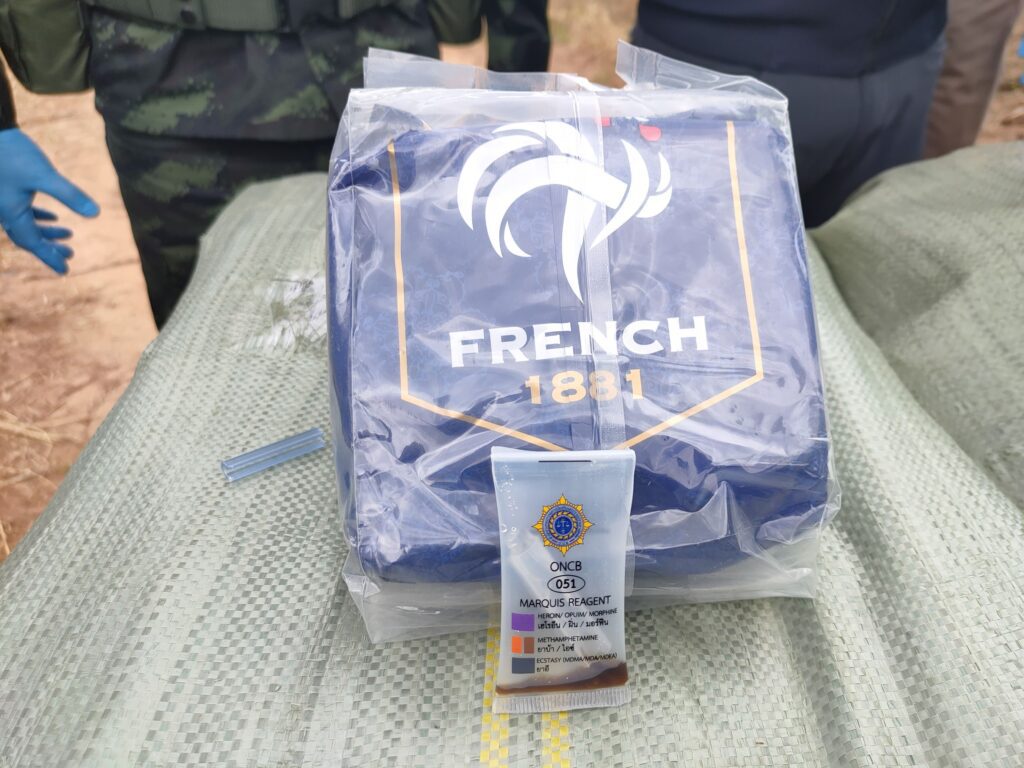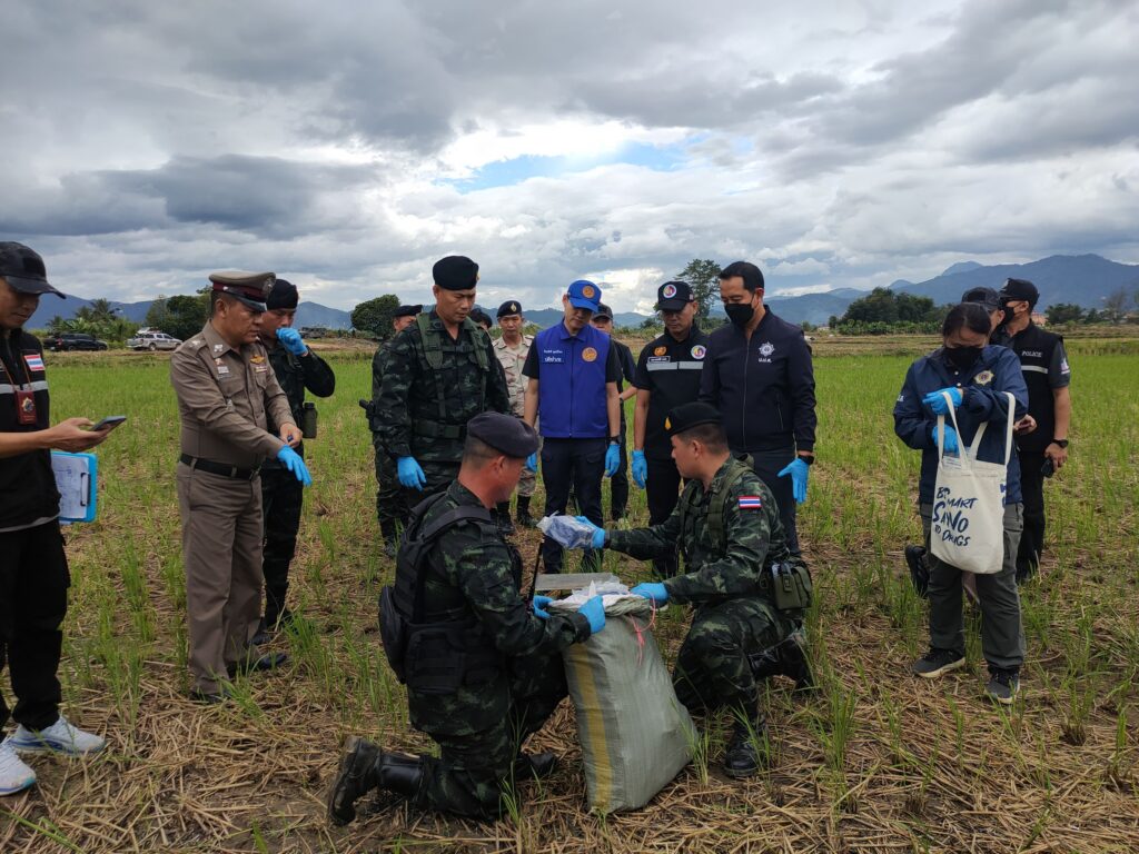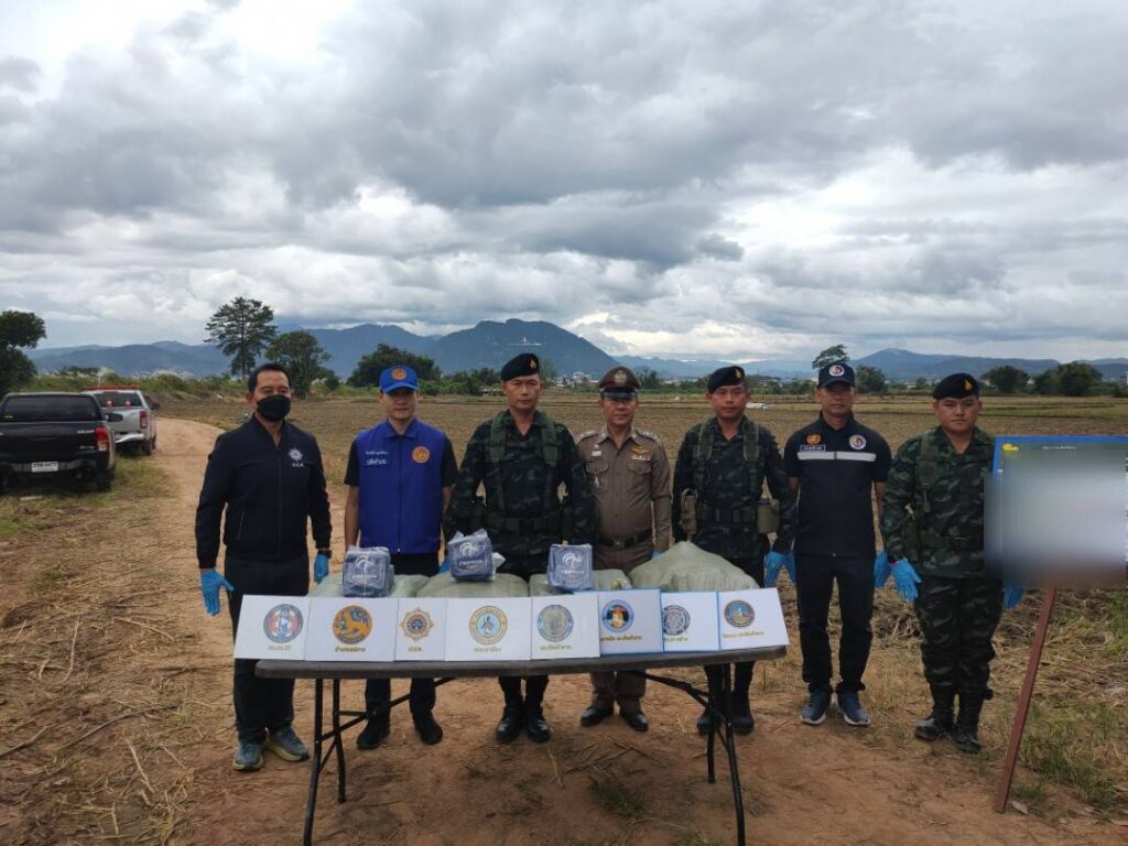 ต่อมาเมื่อวันที่ 8 พฤศจิกายน 2568 เวลา 06.30 น. เจ้าหน้าที่ได้จัดกำลังพลทำการ ลาดตระเวนพิสูจน์ทราบ บริเวณพื้นที่เกิดเหตุ ตรวจพบกระสอบดัดแปลงเป็นเป้สะพายหลัง จำนวน 4 กระสอบ ภายในบรรจุยาเสพติดให้โทษประเภท 1 (ไอซ์) กระสอบละ 25 ก้อน น้ำหนักก้อนละ 1 กิโลกรัม รวมจำนวนทั้งสิ้นประมาณ 100 ก้อน น้ำหนักรวมประมาณ 100 กิโลกรัม