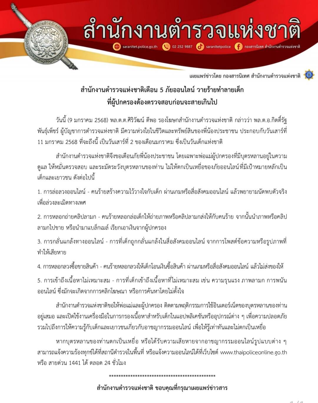 สำนักงานตำรวจแห่งชาติ เตือน 5 ภัยออนไลน์ วายร้ายทำลายเด็ก ที่ผู้ปกครองต้องตรวจสอบก่อนจะสายเกินไป
