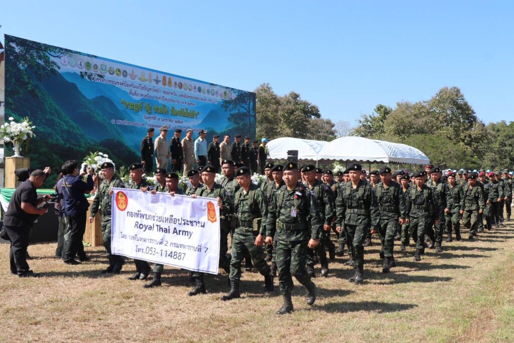 พลโท วรเทพ บุญญะ แม่ทัพภาคที่ 3 เปิดเผยว่า กองทัพภาคที่ 3 ได้ร่วมกับทุกภาคส่วนจัดตั้งศูนย์ปฏิบัติการป้องกันและแก้ไขปัญหาไฟป่า หมอกควัน และฝุ่นละอองขนาดเล็ก PM2.5 ณ กองพลทหารราบที่ 7 ระหว่างวันที่ 15 พฤศจิกายน 2568 ถึง 30 เมษายน 2569 ซึ่งทำหน้าที่เป็นศูนย์กลางประสานงาน อำนวยการ วางแผน ควบคุม และดับไฟป่า ครอบคลุมพื้นที่ 17 จังหวัด รวมถึงพื้นที่รอยต่อจังหวัดอีกด้วย พร้อมทั้งกำหนดพื้นที่เฝ้าระวังสำคัญ 12 ป่าแปลงใหญ่ ครอบคลุมพื้นที่เสี่ยงใน 17 จังหวัด โดยบูรณาการงบประมาณ ผนึกกำลังพล เจ้าหน้าที่ เครือข่ายอาสาสมัคร ยุทโธปกรณ์ เครื่องมือ ยานพาหนะ และอากาศยานอย่างเป็นระบบ ควบคู่กับการเฝ้าระวัง ติดตาม ประเมินสถานการณ์ และรายงานผลต่อคณะกรรมการอำนวยการจัดการปัญหามลพิษทางอากาศอย่างต่อเนื่อง ส่วนการเตรียมการรับมือปีนี้เป็นไปด้วยความเรียบร้อย และวันนี้ถือเป็นการ Kick off ประกาศให้ทุกคนทราบว่าเราพร้อมที่จะรับมือกับไฟป่า โดยทางกองทัพได้มีการจัดเตรียมกำลังพลไว้สำหรับการสนับสนุนภารกิจไฟป่า 168 ชุด จำนวน 700 นาย ซึ่งขณะนี้กำลังพลบางส่วนได้มีการเข้าพื้นที่ไปประจำจุดแล้ว พร้อมปฏิบัติหน้าที่อย่างต่อเนื่องจนกว่าสถานการณ์จะคลี่คลาย
