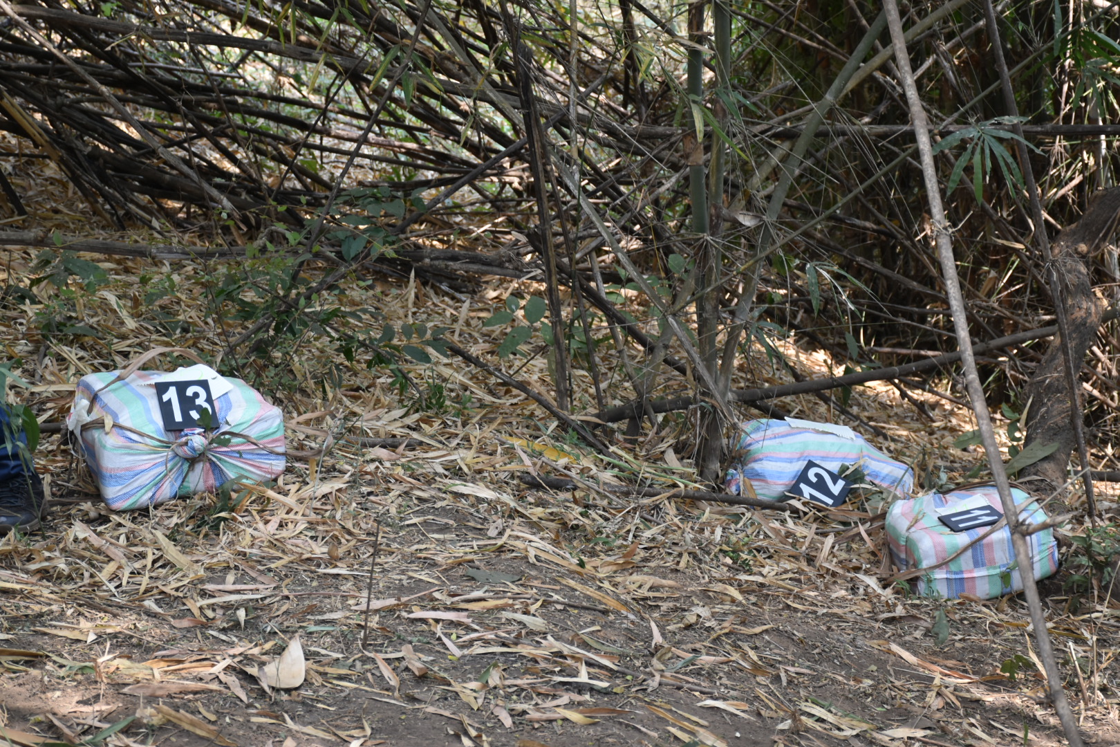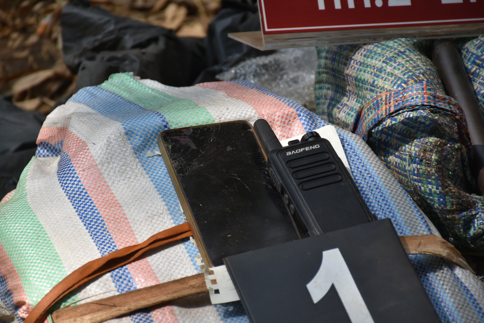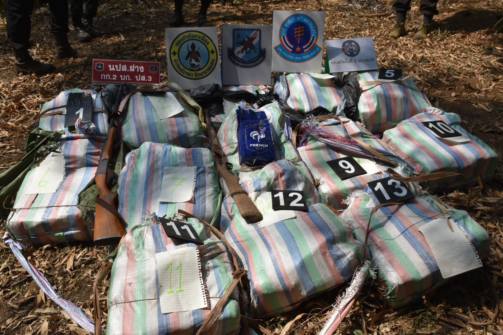 1. กระสอบดัดแปลงเป็นเป้สะพายหลัง จำนวน 13 กระสอบ ภายในบรรจุยาเสพติดให้โทษประเภท 1 (ไอซ์) กระสอบละประมาณ 10-15 กิโลกรัม รวมน้ำหนักประมาณ 195 กิโลกรัม