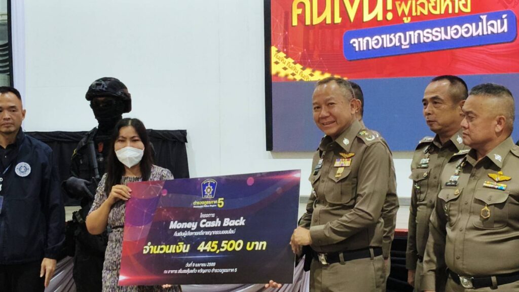 ไฮไลต์สำคัญคือการขยายผลทลายเครือข่ายคอลเซ็นเตอร์กลางเมืองเชียงใหม่ โดยเมื่อวันที่ 1 เมษายนที่ผ่านมา เจ้าหน้าที่ชุดสืบสวน ศปอส.ภ.5 ได้บุกรวบตัวผู้ต้องหา 2 ราย คือ น.ส.สุภัสรา และ นายศรราม ขณะกำลังถอนเงินสดจำนวน 445,500 บาท จากเคาน์เตอร์ธนาคารกสิกรไทย สาขาตลาดมีโชคพลาซ่า ซึ่งเป็นเงินที่ได้จากการหลอกลวงเหยื่อในคดีฉ้อโกงออนไลน์ โดยอ้างเป็นเจ้าหน้าที่หน่วยงานทหารหลอกให้สำรองเงินซื้อแผงกั้นแบเรียอร์ ผู้ต้องหาทั้งสองรับสารภาพว่ารับจ้างเปิดบัญชีม้าและตระเวนถอนเงินสดตามคำสั่งเพื่อแลกกับค่าจ้าง เจ้าหน้าที่จึงทำการยึดของกลางเป็นเงินสดทั้งหมดเพื่อเร่งส่งคืนให้แก่ผู้เสียหายและดำเนินคดีในข้อหาอั้งยี่ต่อไป