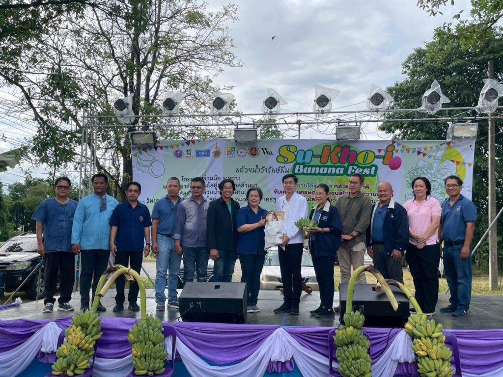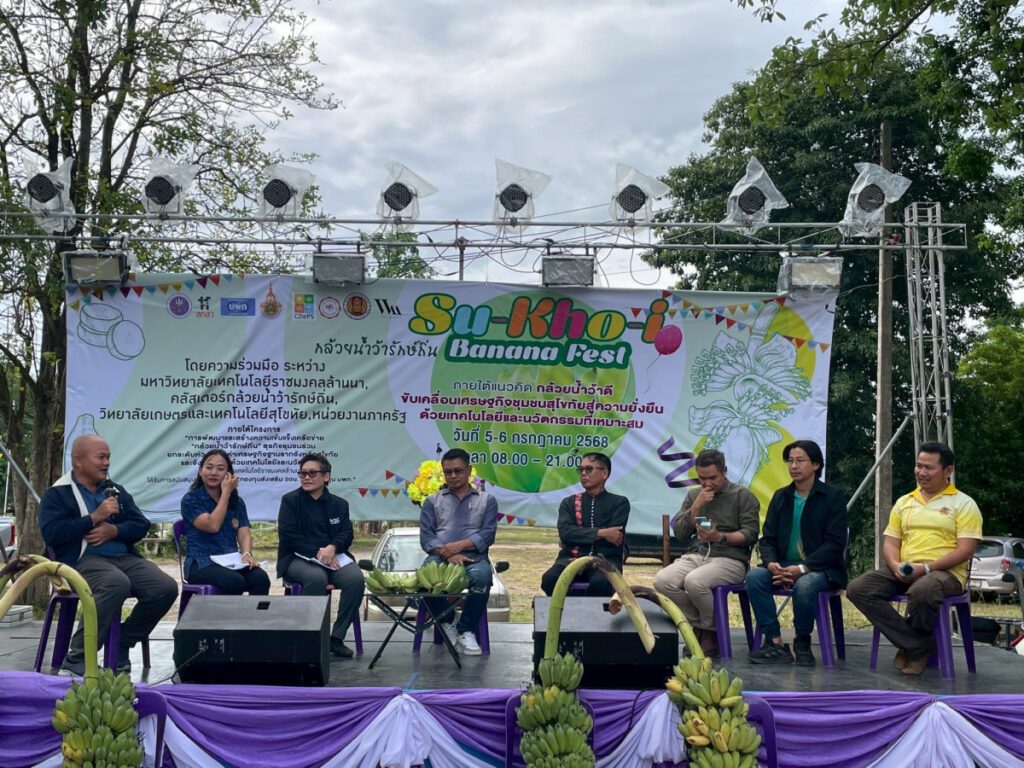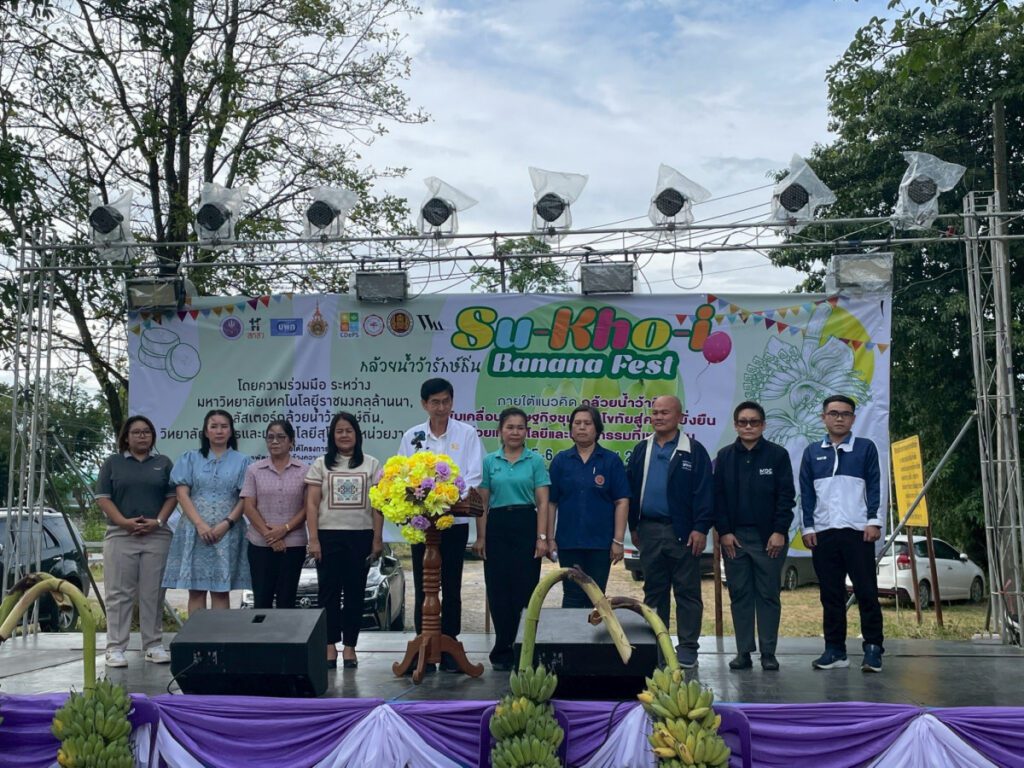 ดร.สุภาวดี แช่ม หัวหน้าชุดโครงการวิจัย สถาบันวิจัยเทคโนโลยีเกษตร มหาวิทยาลัยเทคโนโลยีราชมงคลล้านนา พร้อมด้วย รศ.ดร.รุ่งนภา ช่างเจรจา และ ดร.ภัทราภรณ์ ศรีสมรรถการ หัวหน้าโครงการย่อย ร่วมกับนักวิจัยจากมหาวิทยาลัยชั้นนำ อาทิ จุฬาลงกรณ์มหาวิทยาลัย มหาวิทยาลัยศรีนครินทรวิโรฒ และมหาวิทยาลัยธรรมศาสตร์ศูนย์ลำปาง จัดกิจกรรม Su-kho-i Banana Fest ณ ศูนย์แสดงและจำหน่ายสินค้าหนึ่งตำบลหนึ่งผลิตภัณฑ์ อำเภอสวรรคโลก จังหวัดสุโขทัย ระหว่างวันที่ 5-6 กรกฎาคม 2568 โดยได้รับเกียรติจาก นายธีรยุทธ สำราญทรัพย์ รองผู้ว่าราชการจังหวัดสุโขทัย เป็นประธานในพิธีเปิดงาน