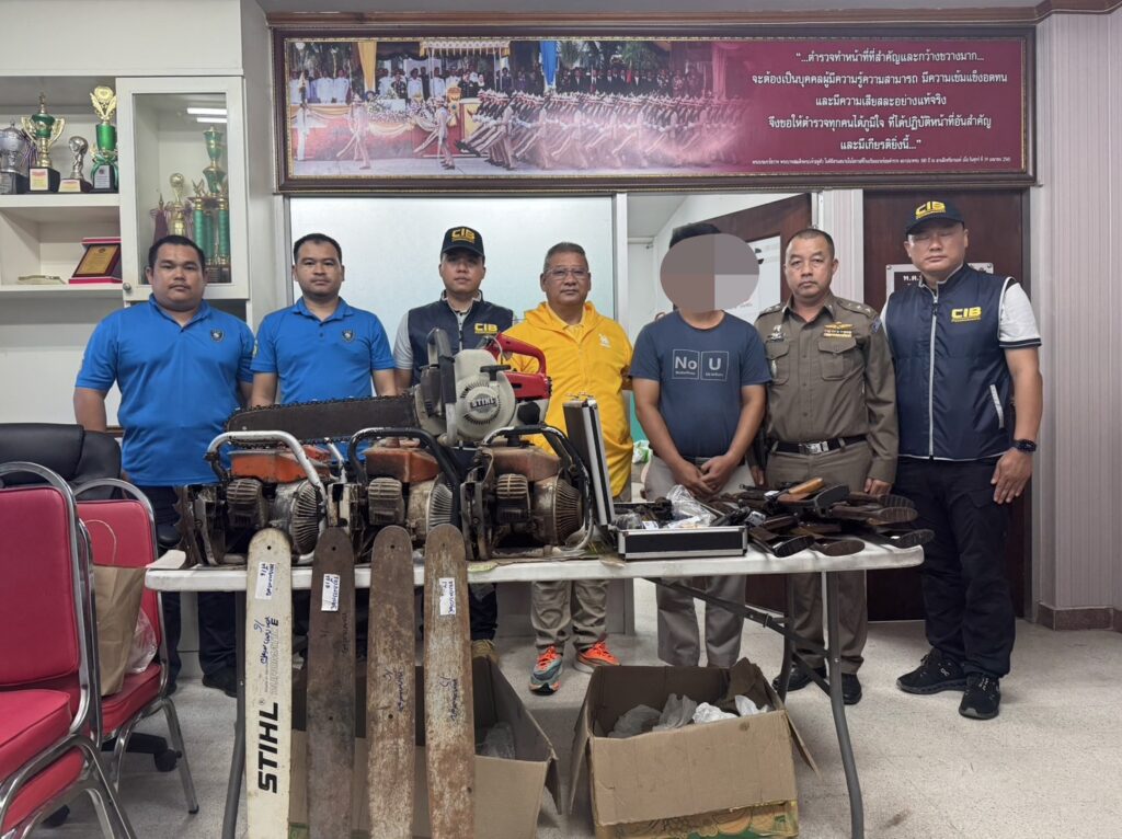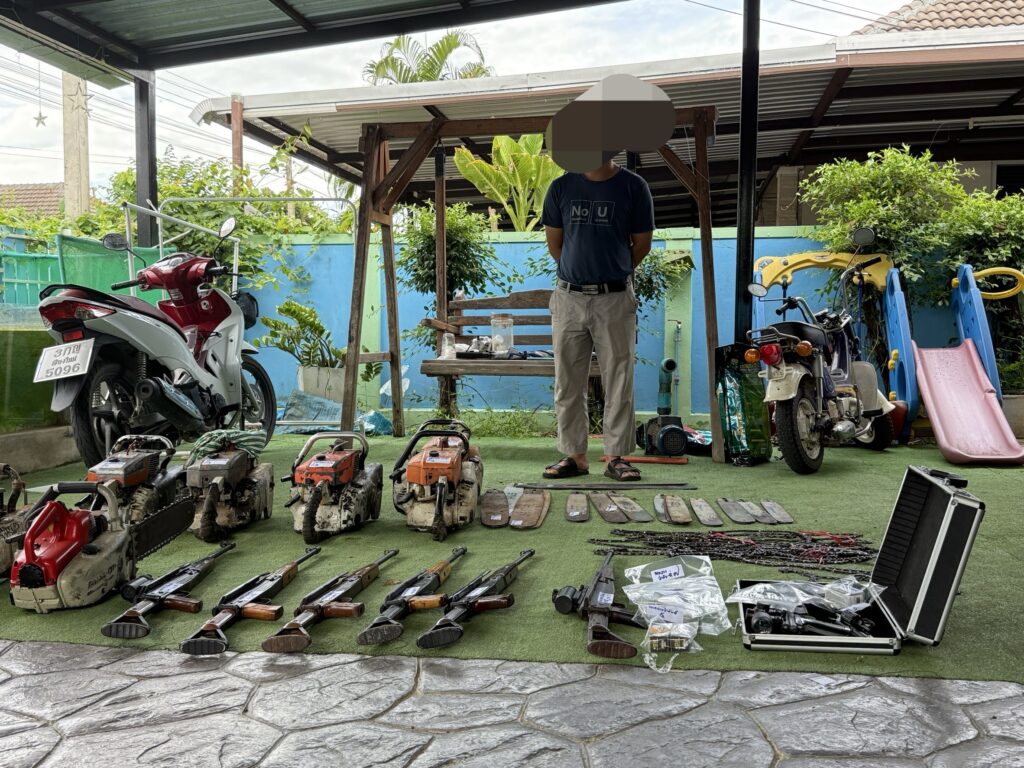 กำลังเจ้าหน้าที่ตำรวจกองบังคับการตำรวจสืบสวนสอบสวนอาชญากรรมทางเทคโนโลยี เจ้าหน้าที่ตำรวจกองบังคับการปราบปรามการกระทำความผิดเกี่ยวกับทรัพยากรธรรมชาติและสิ่งแวดล้อม เจ้าหน้าที่กองกำกับการปฏิบัติการพิเศษ กองบังคับการสืบสวนตำรวจภูธรภาค 5 และเจ้าหน้าที่ตำรวจ สภ.สารภี นำหมายศาลเข้าตรวจค้นบ้านหลังหนึ่งในหมู่ บ้านป่าเก็ตถี่ ต.หนองผึ้ง อ.สารภี จ.เชียงใหม่ หลังสืบทราบว่านายชาย นามสมมุติ อายุ 39 ปี ที่อาศัยอยู่บ้านหลังดังกล่าวมีพฤติกรรมรับซื้อเลื่อยยนต์จากร้านขายของเก่ามาดัดแปลงซ่อมแซมเพื่อจำหน่ายในโลกออนไลน์ จากการตรวจค้นพบอาวุธปืนสั้นขนาด . 22 มม. 1 กระบอก พร้อมลูกกระสุนขนาด .22 มม. 135 นัด อยู่ในกล่องเหล็กวางอยู่ในห้องเก็บของ จากการตรวจสอบพบมีใบอนุญาตแบบ ป.4 ชื่อเจ้าของเป็นชาวบ้านอำเภอดอยสะเก็ด ปืนสั้นอัดลม 1 กระบอก ปืนยาวอัดลม 7 กระบอก กระสุนปืนอัดลม 582 นัด นอกจากนี้เลื่อยโซ่ยนต์ 7 เครื่อง แผ่นบังคับเลื่อยโซ่ยนต์ 15 แผ่น และโซ่เลื่อยยนต์ 12 เส้น วางอยู่ในห้องเก็บของ และรอบๆบ้านหลังดังกล่าว จากการตรวจสอบของเจ้าหน้าที่พบว่าเลื่อยโซ่ยนต์ทั้งหมด มีขนาดกำลังเกินกว่ากฎหมายกำหนด ส่วนขนาดความยาวของแผ่นบังคับโซ่ยาวเกินกว่าที่กฎหมายกำหนดไว้