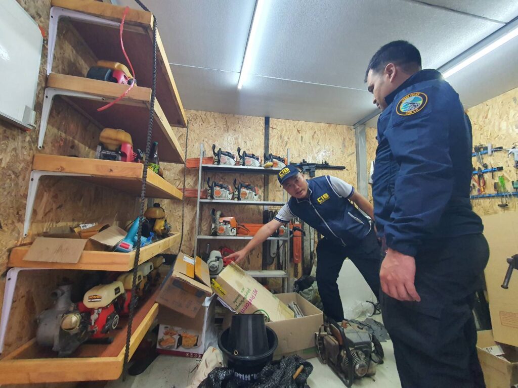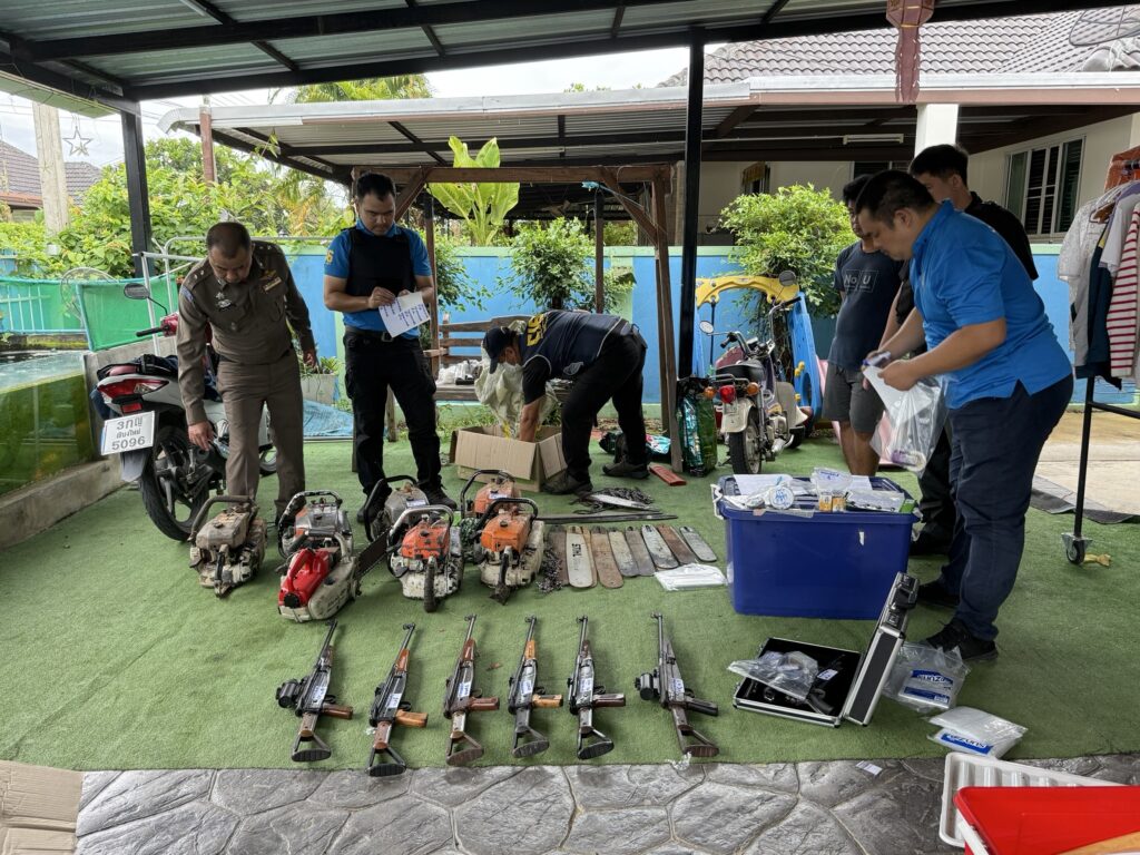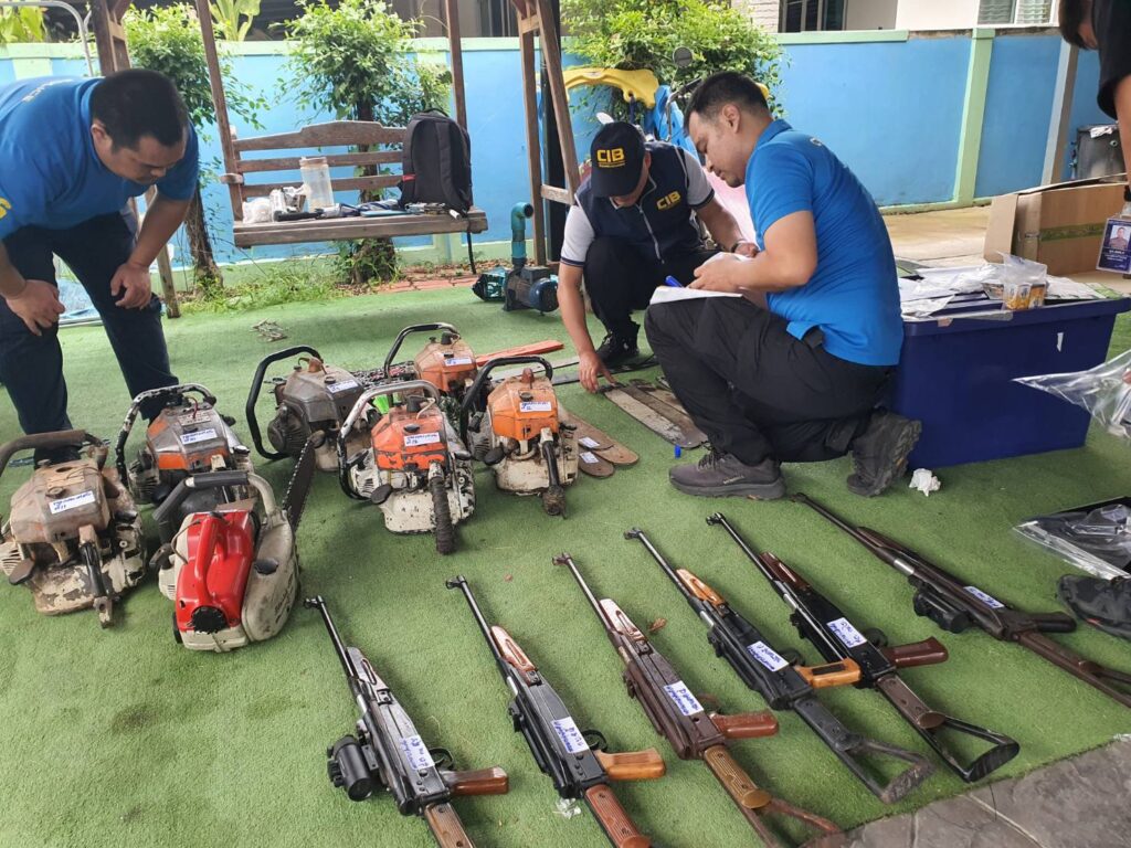 กำลังเจ้าหน้าที่ตำรวจกองบังคับการตำรวจสืบสวนสอบสวนอาชญากรรมทางเทคโนโลยี เจ้าหน้าที่ตำรวจกองบังคับการปราบปรามการกระทำความผิดเกี่ยวกับทรัพยากรธรรมชาติและสิ่งแวดล้อม เจ้าหน้าที่กองกำกับการปฏิบัติการพิเศษ กองบังคับการสืบสวนตำรวจภูธรภาค 5 และเจ้าหน้าที่ตำรวจ สภ.สารภี นำหมายศาลเข้าตรวจค้นบ้านหลังหนึ่งในหมู่ บ้านป่าเก็ตถี่ ต.หนองผึ้ง อ.สารภี จ.เชียงใหม่ หลังสืบทราบว่านายชาย นามสมมุติ อายุ 39 ปี ที่อาศัยอยู่บ้านหลังดังกล่าวมีพฤติกรรมรับซื้อเลื่อยยนต์จากร้านขายของเก่ามาดัดแปลงซ่อมแซมเพื่อจำหน่ายในโลกออนไลน์ จากการตรวจค้นพบอาวุธปืนสั้นขนาด . 22 มม. 1 กระบอก พร้อมลูกกระสุนขนาด .22 มม. 135 นัด อยู่ในกล่องเหล็กวางอยู่ในห้องเก็บของ จากการตรวจสอบพบมีใบอนุญาตแบบ ป.4 ชื่อเจ้าของเป็นชาวบ้านอำเภอดอยสะเก็ด ปืนสั้นอัดลม 1 กระบอก ปืนยาวอัดลม 7 กระบอก กระสุนปืนอัดลม 582 นัด นอกจากนี้เลื่อยโซ่ยนต์ 7 เครื่อง แผ่นบังคับเลื่อยโซ่ยนต์ 15 แผ่น และโซ่เลื่อยยนต์ 12 เส้น วางอยู่ในห้องเก็บของ และรอบๆบ้านหลังดังกล่าว จากการตรวจสอบของเจ้าหน้าที่พบว่าเลื่อยโซ่ยนต์ทั้งหมด มีขนาดกำลังเกินกว่ากฎหมายกำหนด ส่วนขนาดความยาวของแผ่นบังคับโซ่ยาวเกินกว่าที่กฎหมายกำหนดไว้