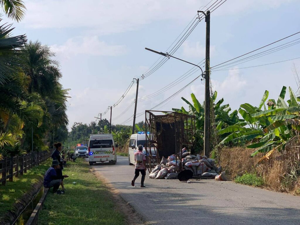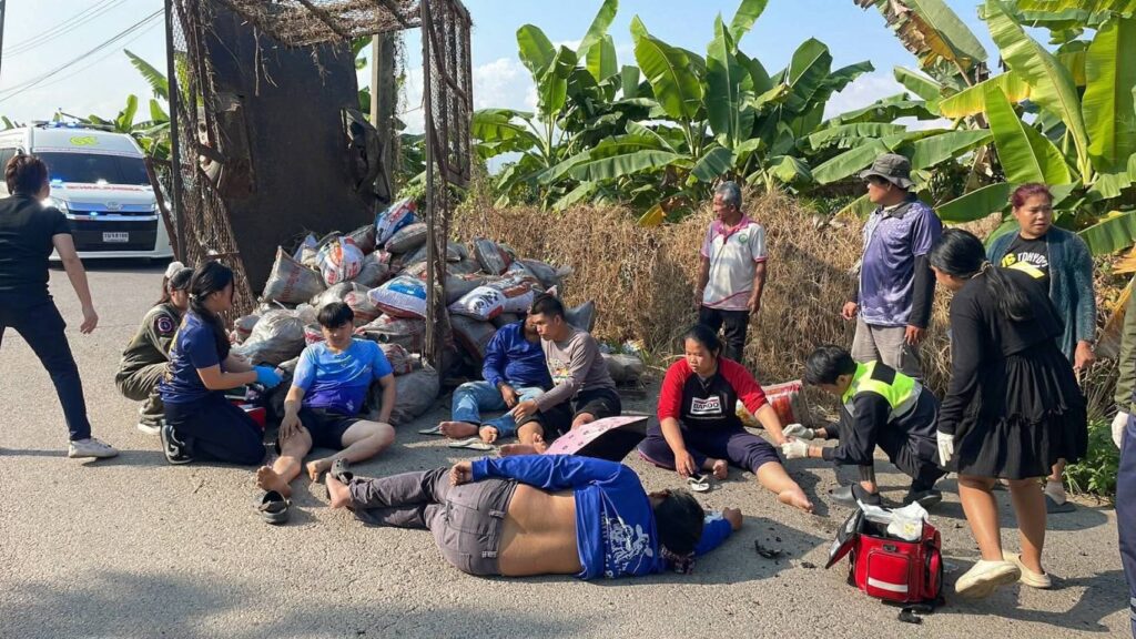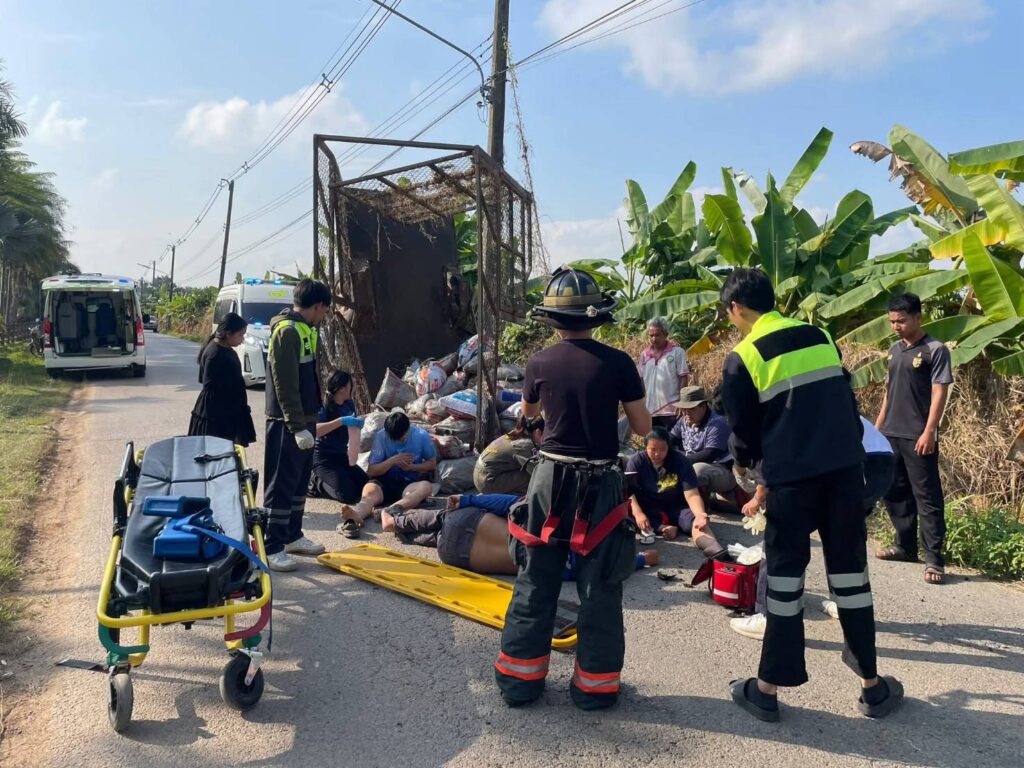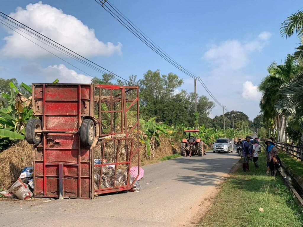 เชียงใหม่-อุบัติเหตุรถไถลากจูงพ่วงท้ายพลิกคว่ำข้างสวนนงนุช นักศึกษา ม.แม่โจ้ บาดเจ็บ 5 ราย