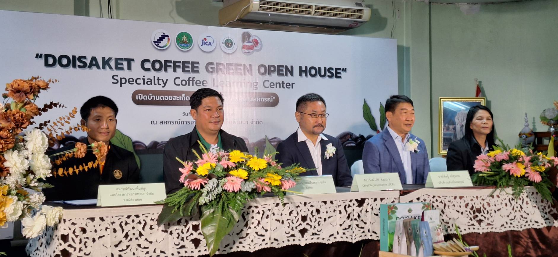 Mr.Suzuki Kazuya ผู้อำนวยการองค์การความร่วมมือระหว่างประเทศของญี่ปุ่น (JICA) กล่าวว่า ตนมาประเทศไทยและทำงานที่ไจก้าประเทศไทยเมื่อ 18 ปีก่อน รู้สึกดีใจที่ได้ทำงานกับกรมส่งเสริมสหกรณ์เพื่อส่งเสริมพัฒนาคุณภาพกาแฟดอยสะเก็ดและศักยภาพสหกรณ์ ซึ่งโครงการนี้ไจก้าได้เชิญเจ้าหน้าที่สหกรณ์ ผู้บริหาร เกษตรกร ไปศึกษาดูงานในอุตสาหกรรมกาแฟและการบริหารงานสหกรณ์ที่ญี่ปุ่นไจก้าได้ส่งผู้เชี่ยวชาญและอาสาสมัครเข้ามาทำงานในประเทศไทยเพื่อปรับปรุงเทคนิคการปลูกกาแฟและแนะนำด้านการตลาดการร่วมมือทำงานด้วยกันระหว่างกรมส่งเสริมสหกรณ์ ดอยสะเก็ด เกษตรกรผู้เชี่ยวชาญญี่ปุ่น ทำให้โครงการได้รับรางวัลเลิศรัฐสาขาการมีส่วนร่วมภาครัฐโครงการประสบความสำเร็จ และได้ขยายผลไปจังหวัดน่าน แม่ฮ่องสอน โดยความร่วมมือทำงานอย่างใกล้ชิดโดย กรมส่งเสริมสหกรณ์ เจ้าหน้าที่สหกรณ์จังหวัด สหกรณ์ดอยสะเก็ด ผู้เชี่ยวชาญ ผู้เกี่ยวข้อง ส่งผลให้มีการยกระดับคุณภาพกาแฟของสหกรณ์เป็นกาแฟพิเศษ และได้เปิดศูนย์เรียนรู้กาแฟพิเศษ และขอแสดงความยินดีและขอบคุณที่สนับสนุนโครงการนี้อย่างเต็มที่ใน 5 ปีครึ่งที่ผ่านมา เราประสบความสำเร็จมากมายร่วมกันโดยผ่านการฝึกอบรมผู้เชี่ยวชาญและการทดลองร่วมกันอย่างแข็งขันเพื่อปรับปรุงคุณภาพกาแฟเพื่อให้ความพยายามอย่างต่อเนื่องในการผลิตกาแฟคุณภาพเพื่อให้ทุกคนพึงพอใจ และหวังว่ากาแฟจากสหกรณ์ดอยสะเก็ดจะวางจำหน่ายในญี่ปุ่นในอนาคตอันเป็นผลจากความร่วมมือของเรา ขอขอบคุณอีกครั้งสำหรับความร่วมมือ และหวังว่าธุรกิจกาแฟสหกรณ์ดอยสะเก็ดจะเติบโตก้าวหน้าต่อไปในอนาคต