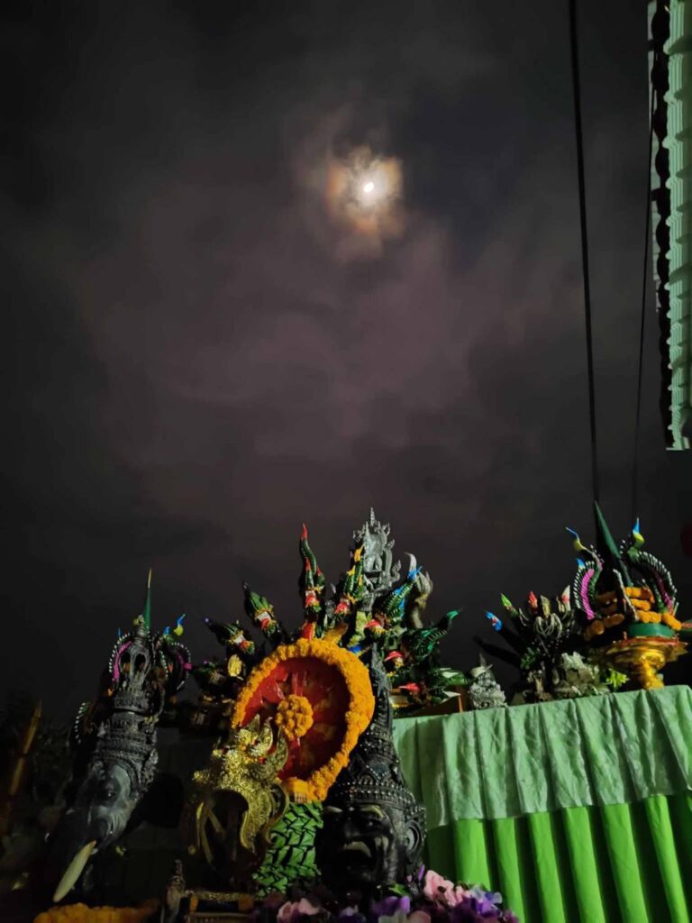 ช่วงกลางคืนวันที่ 8 เมษายน เวลา 22:30 น ก่อนวันงานช่วงเวลาลูกศิษย์ร่วมด้วยช่วยกันจัดตั้งปรำพิธีบายศรีได้มีปรากฏก็มี “พระจันทร์เกิดการทรงกลด” ตรงหน้าบนยอดปรำพิธี สื่อถึงความหมายที่ดีมาก.