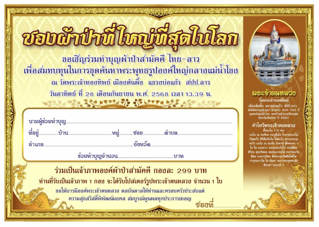 เมื่อเวลา 9.00 น. วันที่ 10 กรกฏาคม 2568 นายชวลิต สุริยจันทร์ ประธานมูลนิธิเจ้าพ่อกู่ช้างลำพูน และที่ปรึกษาบ้านโภคทรัพย์ บารมีธรรมลำพูน กล่าวว่า ทางบ้านโภคทรัพย์บารมีธรรม ได้จัดทำผ้าป่าสามัคคี ไทย – ลาว ซองใหญ่ที่สุดในโลก เพื่อสมทบทุุนในการขุดค้นหาพระพุทธรูปองค์ใหญ่ซึ่งจมน้ำอยู่ริมแม่น้ำโขง ณ วัดพระเจ้าทองทิพย์ เมืองต้นผึ้ง แขวงบ่อแก้ว สปป.ลาว ซึ่งเป็นการบูรณะและพัฒนาวัดต่างๆ ตามรอยครูบาเจ้าศรีวิชัย นักบุญแห่งล้านนา ในวันอาทิตย์ที่ 28 กันยายน 2568 ซึ่งซองผ้าป่าสามัคคีดังกล่าว มีขนาด กว้าง ยาว 13×18 นิ้ว ภายในซองยังมีรูปภาพ พระเจ้าตนหลวง ขนาด กว้าง ยาว 12×17.5 นิ้ว โดยก่อนหน้านี้ ได้มีการขุดพบเจอพระเจ้าตนหลวง องค์ใหญ่มาแล้ว เมื่อประมาณกลางปี 67 ที่ผ่านมา จนเป็นข่าวดังมาแล้ว การจัดทำผ้าป่าสามัคคีในครั้งนี้ทางคณะกรรมการได้จัดทำเพียง 900 ซอง เท่านั้น แต่ละซอง มีการพิมพ์หมายเลขซองกำกับทุกซอง ตั้งแต่หมายเลข 1 ถึง หมายเลข 900 แต่ละซองที่ทำบุญได้จัดทำเป็นกองละ 299 บาท